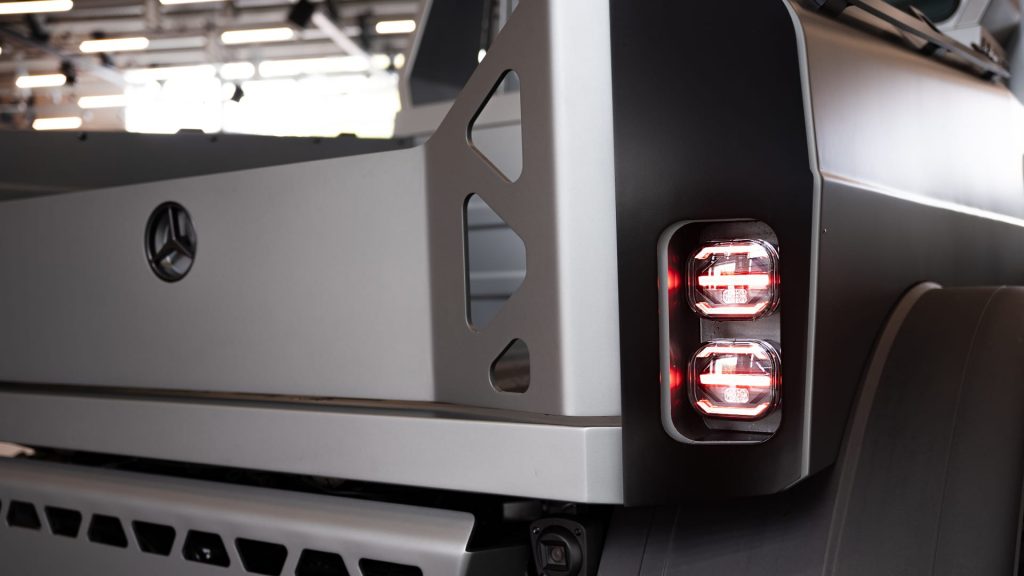 Les capacités en tout-terrain sont conservées, voire améliorées avec un moteur plus puissant. On trouve en effet sous le capot un 6 cylindres 7.7 OM936 de 220 kW / 297 ch. Un gain de 66 chevaux. Il se dote d’une double cabine tendue de cuir à l’intérieur et habillée d’une peinture satinée à l’extérieur. Une peinture qui est la seule concession visible à la fragilité…
