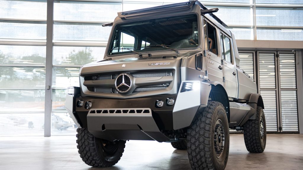 Pour ses 80 ans, Mercedes n’a pas choisi de créer une version encore plus extrême. En réalité, tout ou presque a déjà été fait sur ce thème avec des engins d’expédition ou d’exploration, camions de service en rallye-raid… La division Mercedes Special Trucks propose un Unimog à contre-emploi : un camion de luxe qui pourrait en remontrer à son lointain cousin Classe-G, y compris dans ses versions Square ou Maybach…