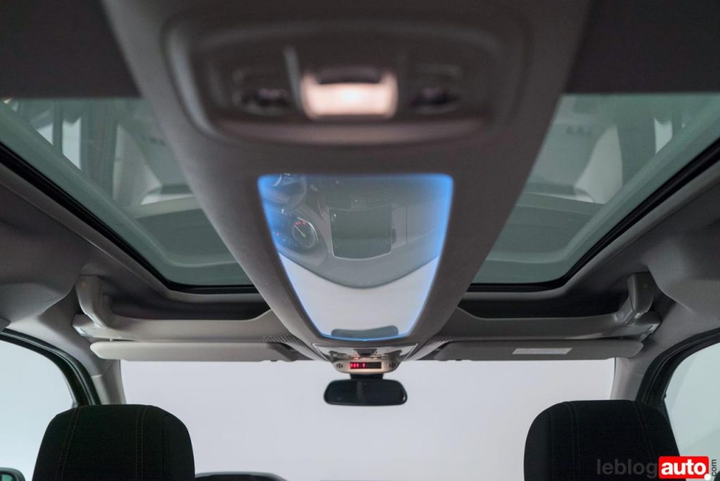La planche de bord a une grande boîte à gant en partie basse, mais, aussi une boîte « fourre-tout » en partie haute. Un bac de rangement se trouve entre les deux fauteuils avant. Au dessus des têtes, divers rangements sont disposés pour accueillir, un peu tout et n’importe quoi.