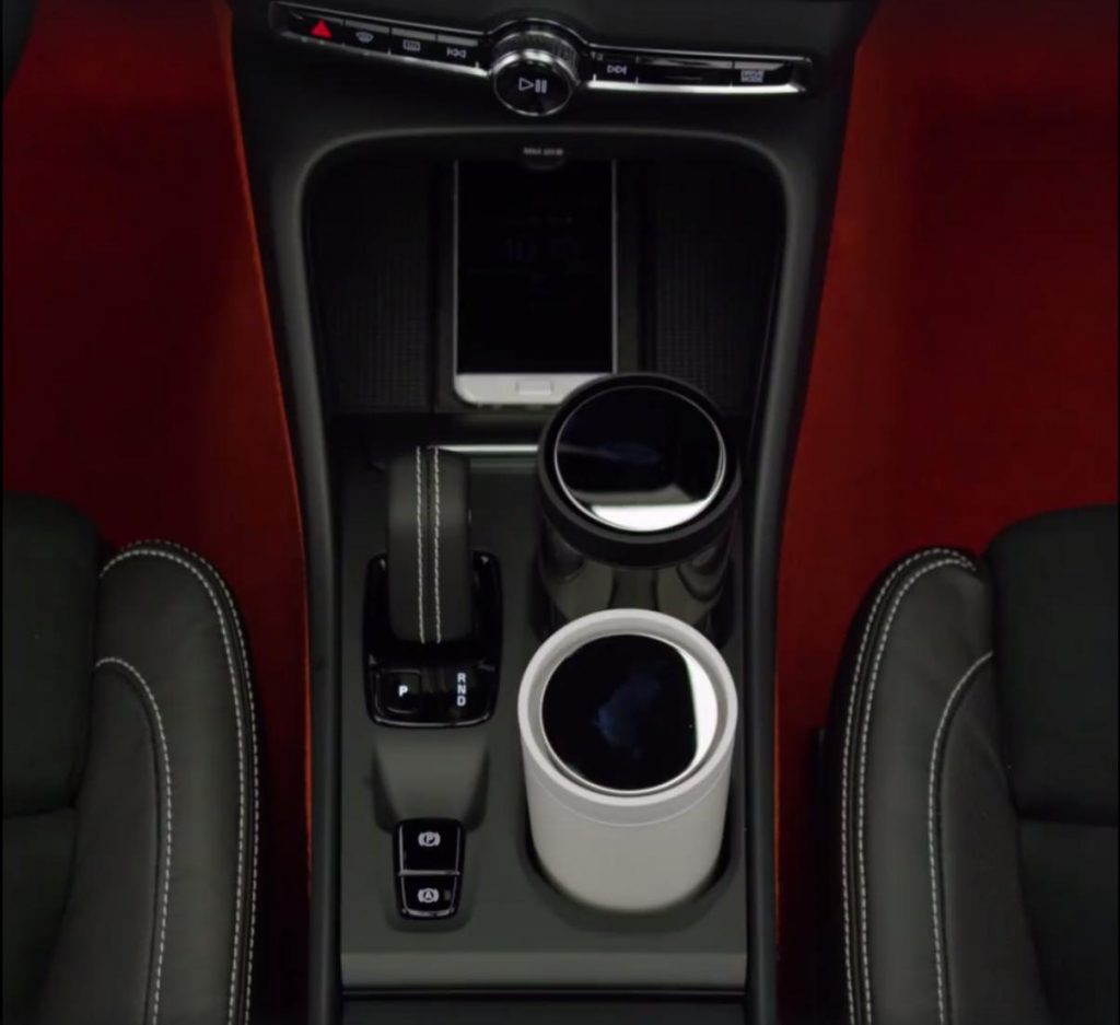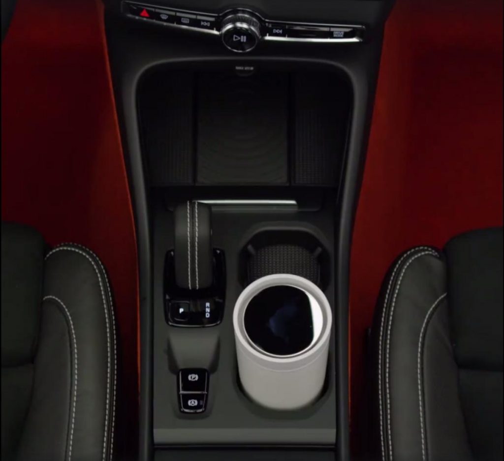 Si l’intérieur n’est pas révélé dans son intégralité, les clichés permettent de voir certains équipements dans leur forme finale. On retrouve l’implantation de l’écran central en position verticale et entouré d’aérateurs comme sur les grandes Volvo. Volvo a également promis d’offrir suffisamment d’astuces de rangements sur le XC40 que l’on découvre sur les photos tel le chargeur à induction pour smartphones.