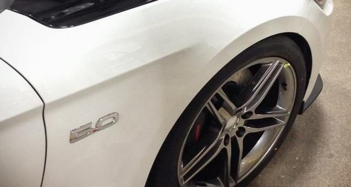 On apprécie la vue du logo 5.0 confirmant, si besoin était, que la base de préparation est bien animée par le V8 5.0 l Coyote, un moteur qui (sûrement gavé par un compresseur) devrait voir sa puissance augmenter de manière conséquente. On peut également apprécier le traitement noir du capot, les quelques prises d’air ainsi que les freins d’origine Brembo.