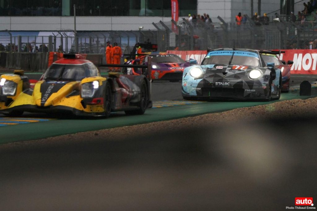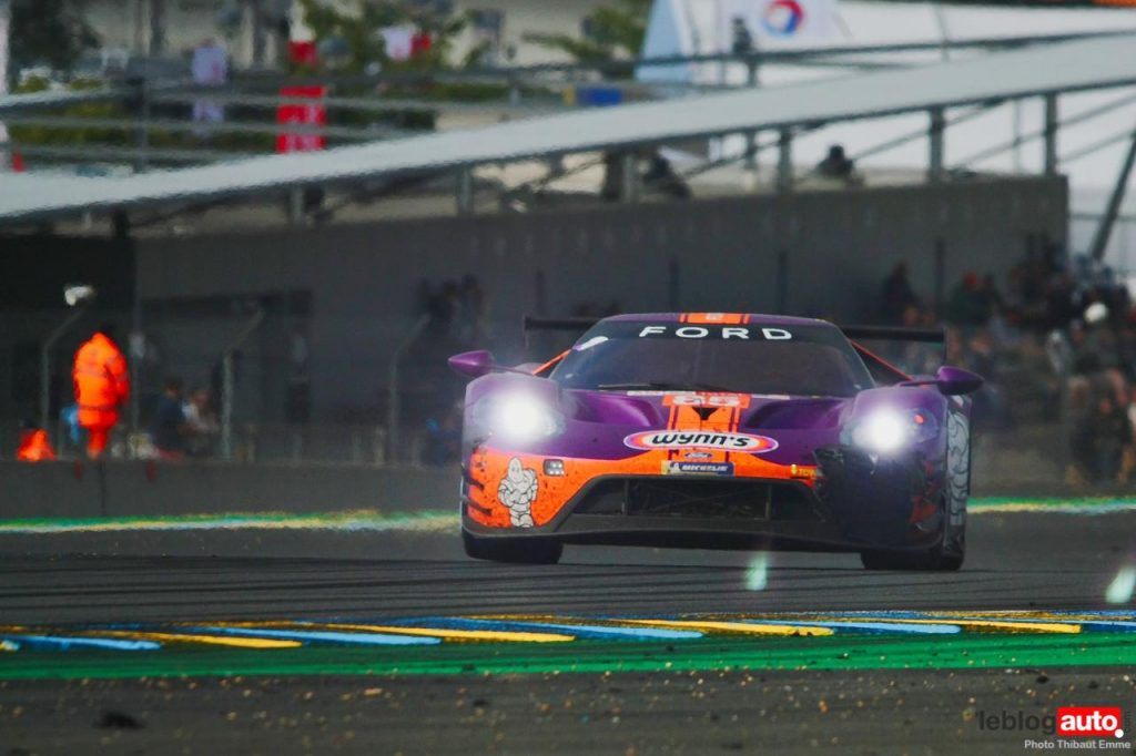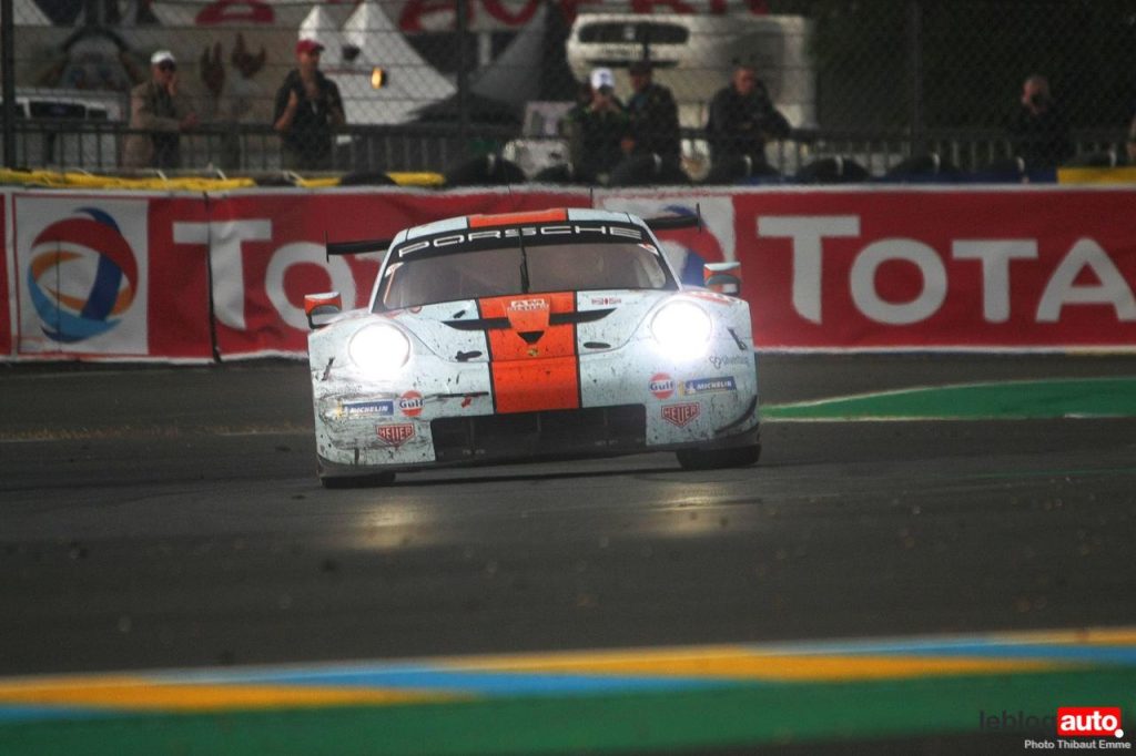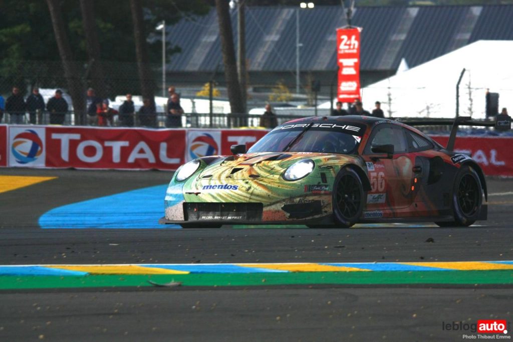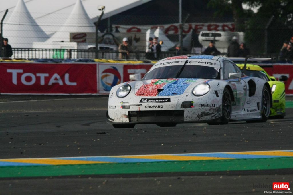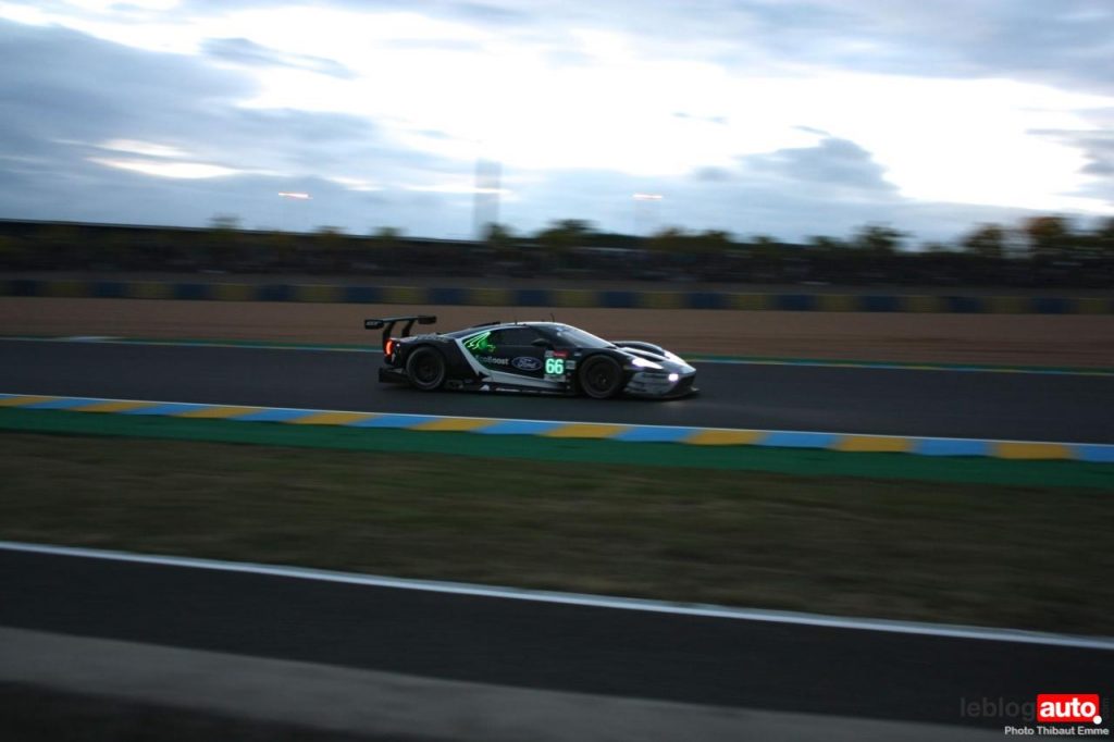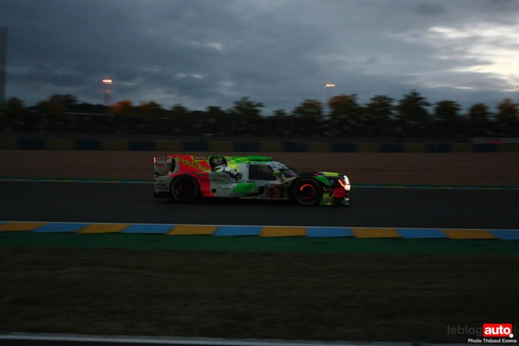 Un petit matin voilé et c’est un levé de soleil sur le Tertre Rouge qui s’envole. On se consolera avec la chicane Dunlop ou les chicanes Ford et du Raccordement. Surtout qu’après des heures de course, les voitures portent les stigmates de la compétitions. Certains ont des morceaux qui manquent, d’autres ont de gros aplats de « gaffer » noir. Mais surtout, toutes ont des traces de gomme, des insectes suicidaires (quelle idée folle de traverser dans la ligne des Hunaudières aussi) et différents liquides balancés par la concurrence.