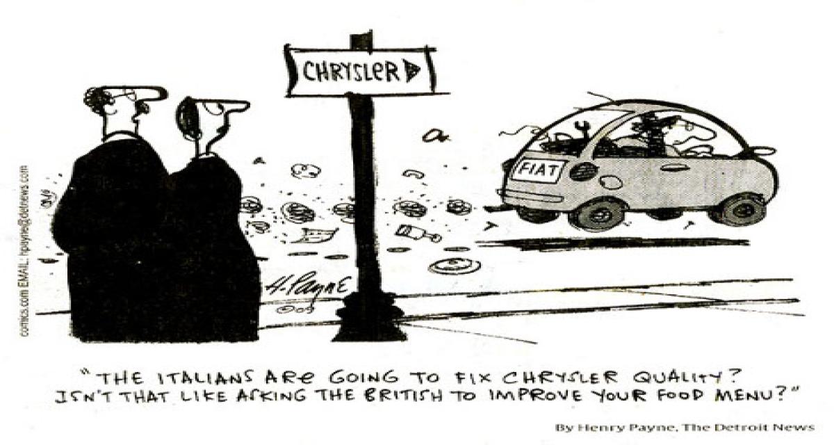 Traduction : « Les Italiens vont prendre en main de la qualité chez Chrysler ? Est-ce que ce ne serait pas comme si on demandait aux Britanniques d’améliorer nos repas ? »