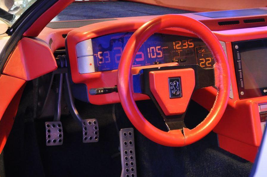 Intérieurement, on reste cependant dans une ambiance futuriste signée Paul Bracq. Ainsi le combiné d’instrumentation est entièrement digital. A cristaux liquides, celui-ci a été conçu par la société Clarion et embarque un GPS rudimentaire, capable de lire les cartes routières et le plan des villes. De plus, il permet l’accès au réseau Télétel (utilisé à l’époque par le Minitel)… Il faut également remarquer les sièges baquets en cuir ornés du sigle Peugeot. Des baquets d’ailleurs identiques à ceux montés la même année sur la 205 Turbo 16 Série 200.