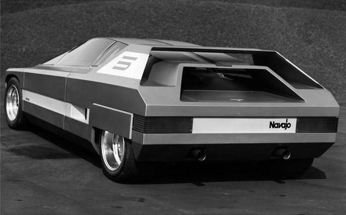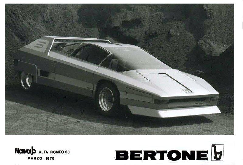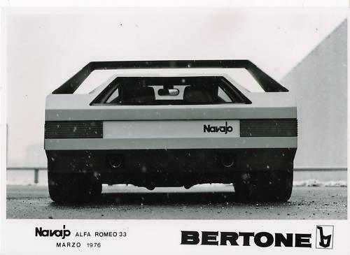 Après la Carabo en 1968, la Navajo est donc le second concept de Bertone utilisant un châssis et une mécanique d’Alfa 33 Stradale. Pininfarina en réalisera pour sa part trois, et Ital Design un. Le thème principal de cette Navajo est l’aérodynamique, dans une époque qui fait la part belle aux sciences et au technologies.