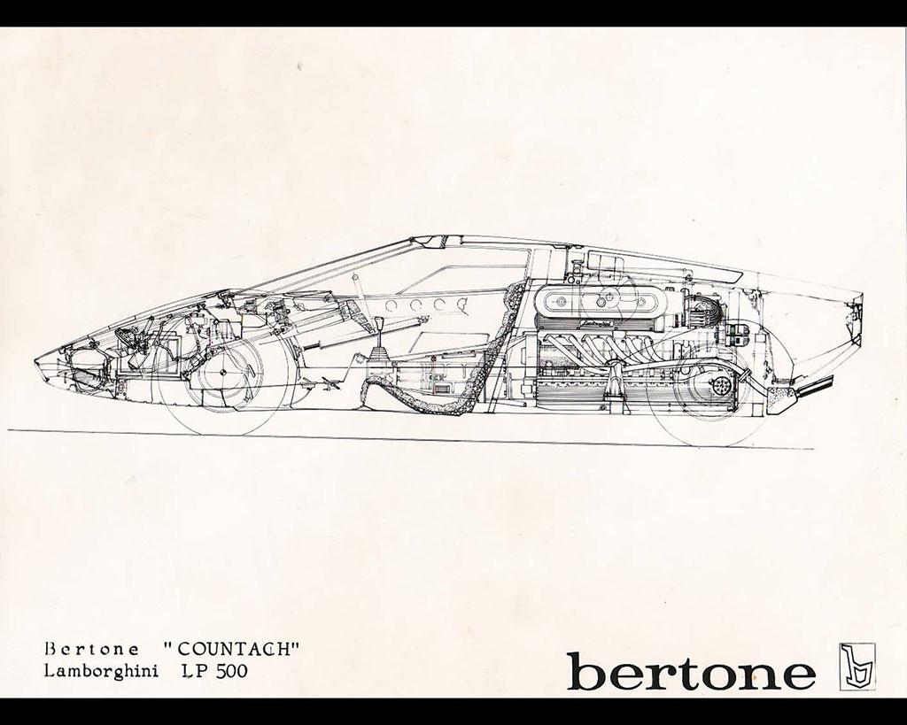 Par rapport à la Miura, elle exprime aussi un changement architectural de taille. Le V12 reste en position centrale arrière, mais passe en longitudinal (il est transversal sur la Miura). Le nom du prototype illustre d’ailleurs ce changement : LP500 pour Longitudinal Posterior 5 litres. Un V12 donné alors pour 440 ch et censé permettre au prototype de passer la barre des 300 km/h et d’effectuer le 0 à 100 en 5 secondes.