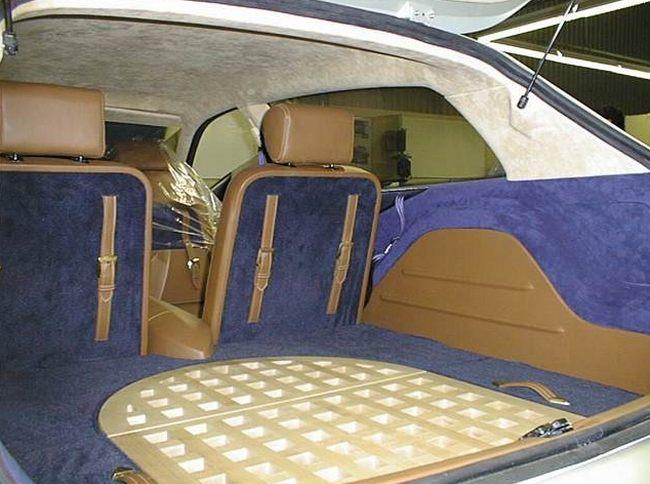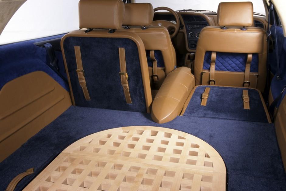 La carrosserie est peinte d’une couleur nacrée irisée. Cette dernière change de teinte selon les reflets de la lumière. A l’intérieur, Heuliez fait appel à ses selliers. Cuir brun, moquette bleu, bois. Les deux sièges arrières se rabattent pour avoir un coffre immense. L’inspiration des matériaux et des couleurs louche du côté de l’équitation. Toute la planche de bord est gainée de cuir. Sans doute un peu « too much », mais l’important est d’impressionner.