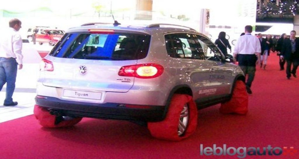 Entre les journées presse et les journées public, certains constructeurs décident de remplacer certaines voitures. Comment faire pour qu’elles ne laissent pas de grosses traces de pneus? Réponse: chez VW, on leur met des chaussons sur les pneus! Apparemment, cela impressionne la sosie d’Angela Davis.