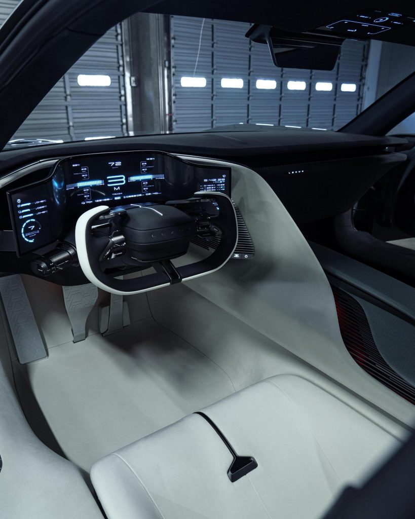 A l’intérieur du concept Lexus, on est dans un vaisseau spatial. En jouant sur les couleurs et en évitant les écrans centraux, Lexus donne l’impression au conducteur qu’il est seul dans un prototype monoplace. Le volant est futuriste, façon volant de course, et les écrans derrière donnent toutes les informations utiles.