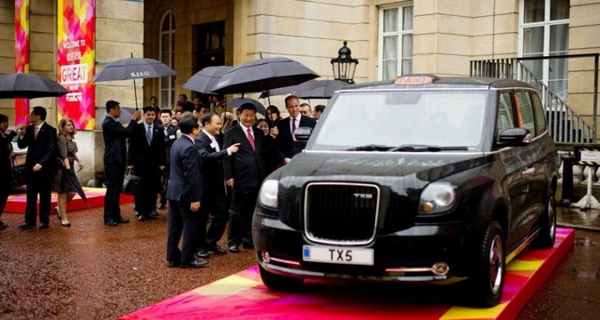 Le TX5 est dévoilé à la Lancaster House, en présence de Xi Jinping, du prince William et de madame. Li Shu Fu (fondateur de Geely) et Peter Johansen (PDG de London Taxi International) jouent les VRP.