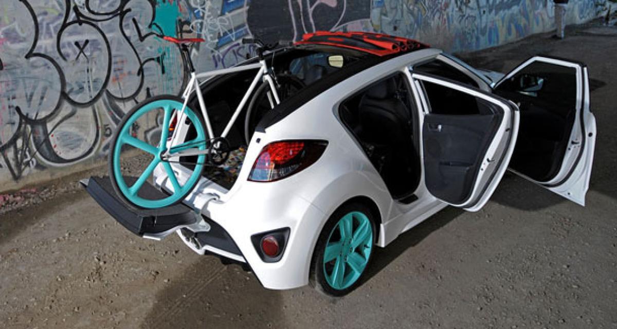 Pour en faire un concept encore plus adapté au salon de Los Angeles, il se transforme en une sorte de petit pick-up avec son abattant arrière, son toit se repliant au choix à l’avant ou à l’arrière… et son plancher de coffre habillé de planches de skate-board recyclées. Dans le même esprit de recyclage, le toit en toile est constitué d’anciennes bâches de camions. Quant aux couleurs qui confirment l’image « décalée » du Veloster, elles sont inspirées de l’univers des fixies, ces vélos personnalisés sans vitesse ni freins… Inspiration uniquement pour la couleur bien entendu.