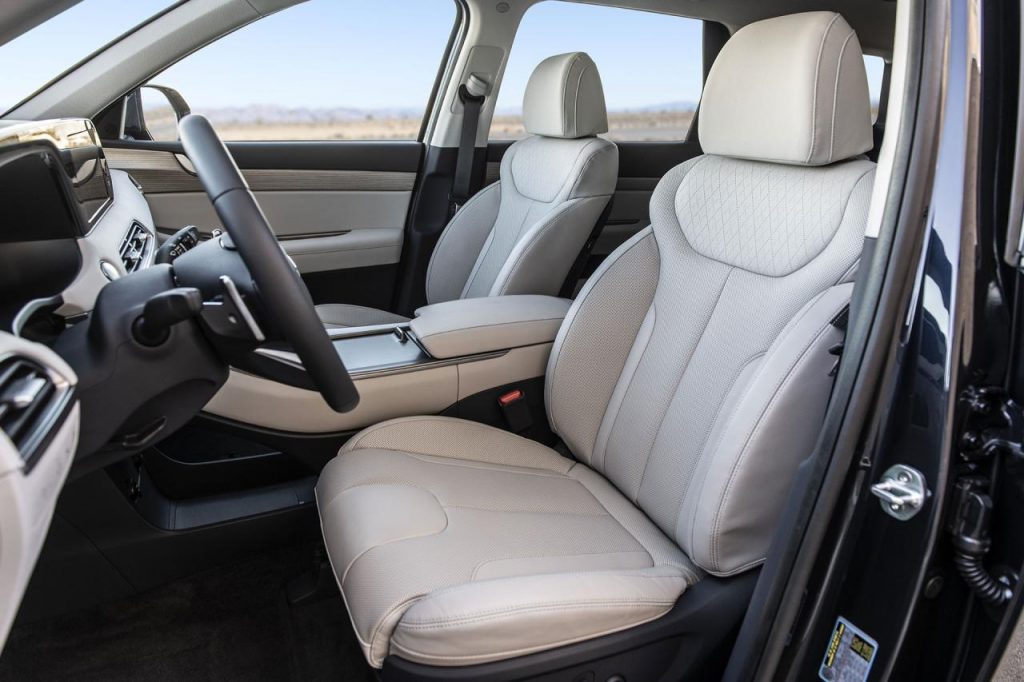 L’idée est de mettre en avant le volume intérieur, pour des véhicules familiaux qui sont les successeurs directs des grands monospaces. Ce qui se confirme à bord avec les trois généreuses rangées de sièges et selon les versions jusqu’à 8 places. A 2 ou 3 places, le second rang est coulissant, et doté d’une fonction d’accès « un bouton » au troisième rang. Ce dernier accueille 3 passagers, avec un fractionnement 60/40, et propose un réglage d’inclinaison du dossier. L’escamotage ou le relevage du 3ème rang sont électriques. Vu la taille de l’engin, Hyundai a pensé à la communication entre l’avant et l’arrière… Un « interphone » interne est donc installé, via les haut-parleurs du système audio, pour communiquer entre le premier et le second, ou le premier et le troisième rang, sans hausser le ton. Il est aussi possible de couper les haut-parleurs arrière pour ne pas déranger les enfants qui dorment, ou regardent leur dessin animé sur leur tablette…