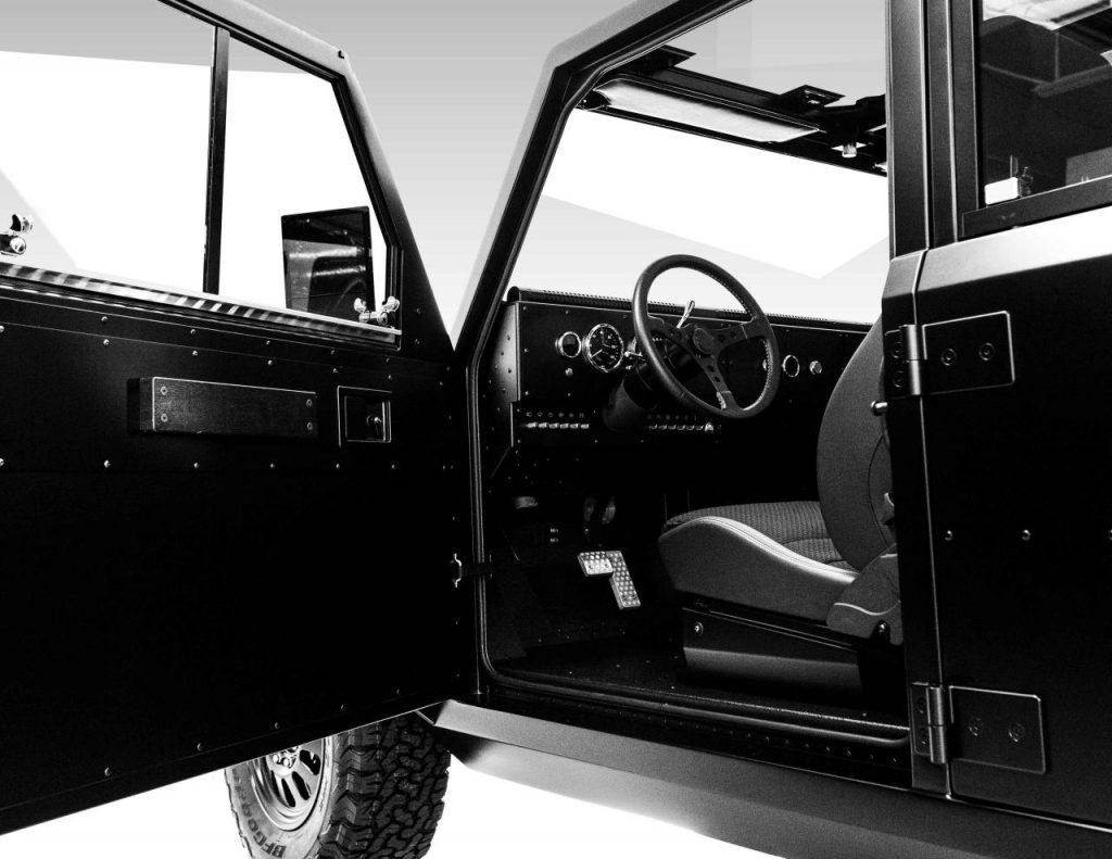 Esthétiquement, c’est sûr, le Cx n’a pas été une préoccupation majeure lors de la conception du véhicule. Avec un physique de boîte à chaussures, l’aérodynamisme est un terme abstrait pour ce colosse, sorte de croisement entre un Hummer, un Land Rover Defender et un truck des années 30. Le Bollinger B2, qui donne cependant la part belle à l’aluminium, ne fait pas dans le galbe. Après tout, ses lignes reflètent la philosophie du projet. A l’intérieur aussi, ambiance minimaliste et spartiate, digne d’une Jeep Willys du débarquement. Même les airbags sont absents !