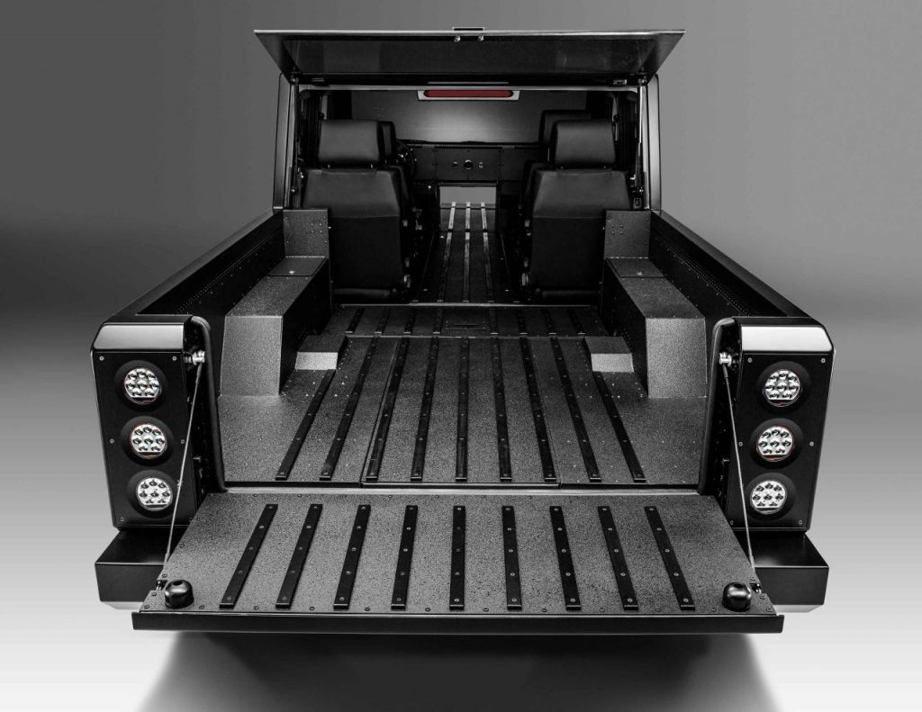 Des 365 chevaux et 640 Nm de couple annoncés à l’origine, nous sommes désormais passés à deux moteurs fournissant au total 620 chevaux mais avec un couple en baisse à 500 Nm. Les monstres seraient capables d’abattre le 0 à 100 Km/h en 4,5 secondes mais avec une vitesse max de seulement 160 km/h pour le B2. Or, l’ambition n’est pas là. Le Bollinger B2 ne lorgne pas du côté d’un Urus voyez-vous. Il veut proposer un pick-up sobre, simple d’utilisation, fait pour durer et pratique. L’entreprise met davantage en avant la capacité de tractage (3400 kilos) et son astucieux système de trappe, qui permet de transporter des objets très longs en les positionnant longitudinalement de part en part du véhicule. Pour les capacités de franchissement, une boîte de transfert à deux vitesses est proposée sur les deux modèles, la hauteur de caisse est de 38 centimètres et le débattement des suspensions de plus de 24 centimètres. Un vrai baroudeur des pistes, ce qui n’est pas la vocation de la plupart des 4×4 branchés.