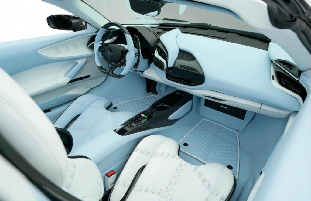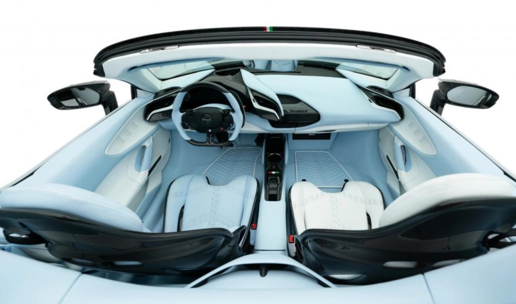 Le cockpit de la nouveau Mansory F9XX Tempesta Celeste est conforme à la tradition avec des couleurs vives qui attirent le regard, mais il paraît plutôt sobre et raffiné par rapport à l'extravagance de l'extérieur. C'est cette fois-ci la couleur bleu clair uniforme qui domine, alors que l'habitacle est entièrement recouvert de cuir de haute qualité jusqu'au dernier coin.
