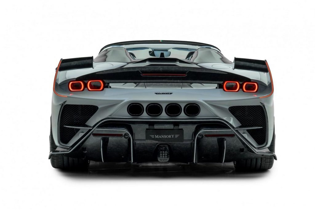 Le double diffuseur et la jupe arrière nouvellement développée sont responsables du guidage parfait du flux d'air sous le véhicule. Dans le même temps, le tablier arrière – en combinaison avec le becquet arrière – augmente la force d'appui sur l'essieu arrière. Le becquet arrière lui-même, contrairement au coupé, est divisé en deux parties et dispose d'un feu de jour supplémentaire sur les bords latéraux. Un système d'échappement impressionnant avec quatre sorties d'échappement complète la vue arrière de cette Ferrari SF90 Spider modifiée . Le tout n’est pas sans rappeler les FXX officielles.