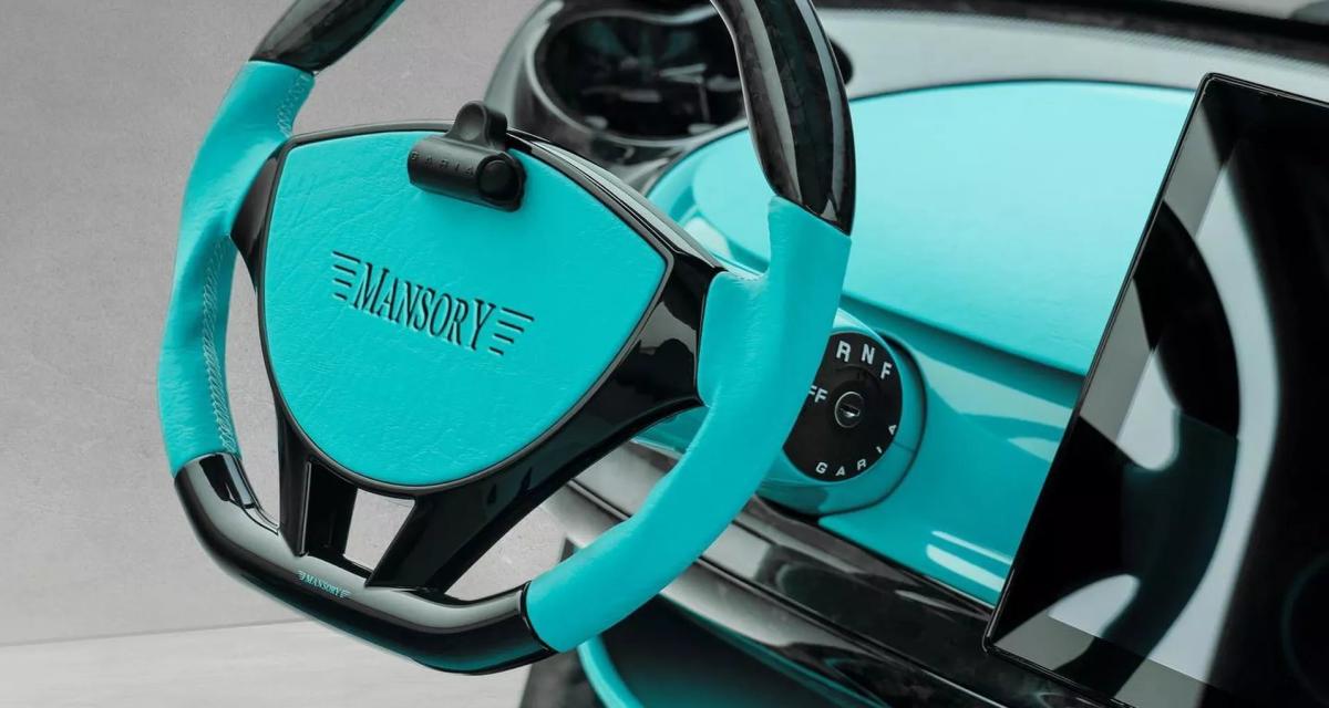 Mansory s’est fait un plaisir évidemment d’y rajouter sa touche personnelle, sans se soucier du coût…et du goût, cela va de soi ! La carrosserie reçoit ainsi le traitement maison en « carbone forgé », présentant un motif de tissage caractéristique qui ressemble aux kits de carrosserie appliqués habituellement sur les supercars et hypercars. Les jantes en alliage ont un plus grand diamètre avec des pneus à profil bas, une plaque de protection avant en forme de diffuseur, une calandre personnalisée, des extensions d'ailes et des accents turquoise ornant toute la carrosserie, histoire qu’on l’aperçoive bien.