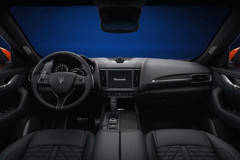 En entrant dans la cabine, les nuances des finitions extérieures sont reprises dans les surpiqûres bleu cobalt et orange, associées au cuir PienoFiore (pleine fleur) noir ou orange et naturel.