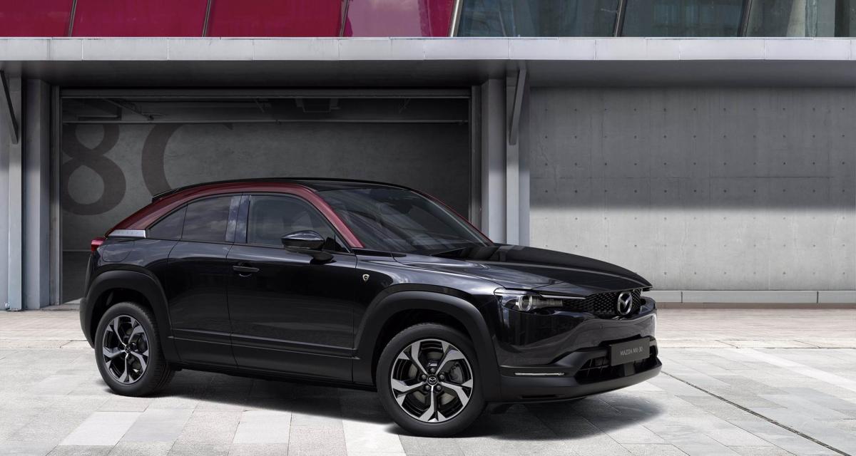 Le Mazda MX-30 R-EV a été dévoilé au Salon de Bruxelles la semaine passée dans une finition spéciale dite "Edition R". Cette série limitée bénéficie d’une finition exclusive Jet Black pour la carrosserie et Maroon Rouge au niveau de ses arches de toit. Clin d'oeil au rotatif, le MX-30 R-EV Edition R a des éléments de design exclusifs comme un logo en forme de rotor avec un e intégré, cousu sur les tapis de sol, ainsi que frappé sur les appuie-tête des fauteuils.