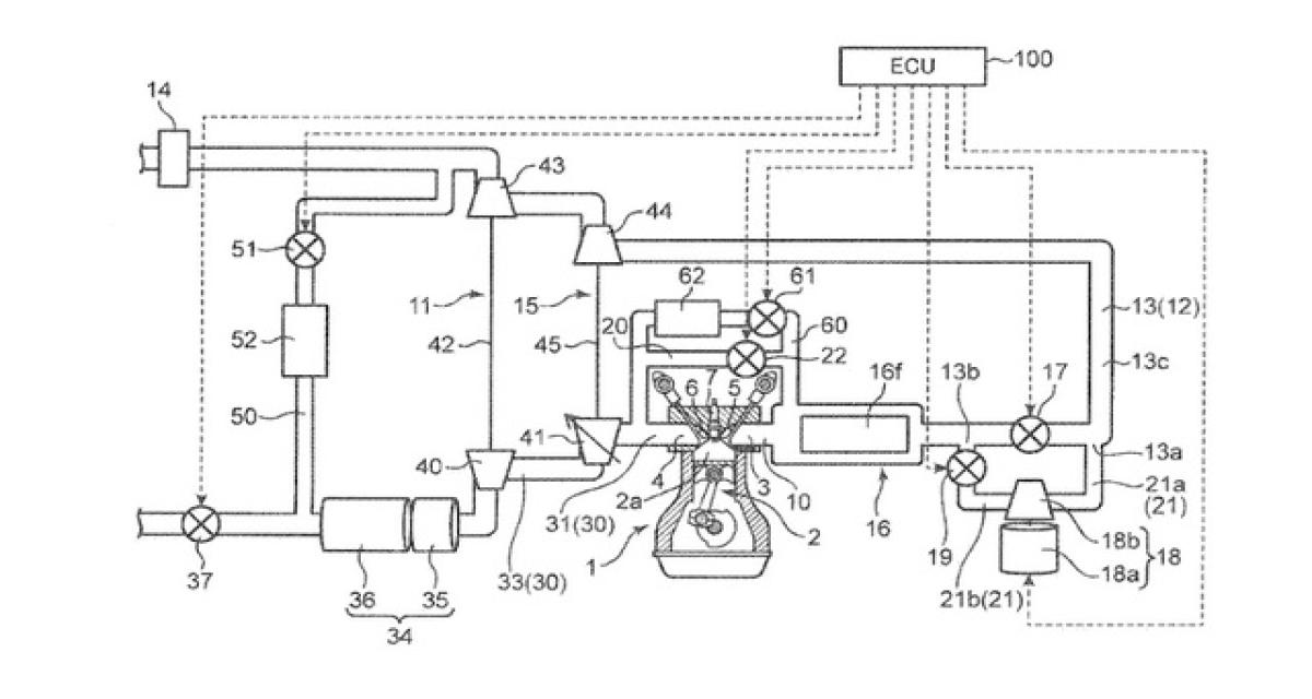 On y voit des schémas qui semblent représenter une motorisation ayant recours à deux turbocompresseurs classiques associés à un turbocompresseur électrique. De quoi théoriquement garantir de meilleures performances tout en réduisant la consommation et les émissions.
