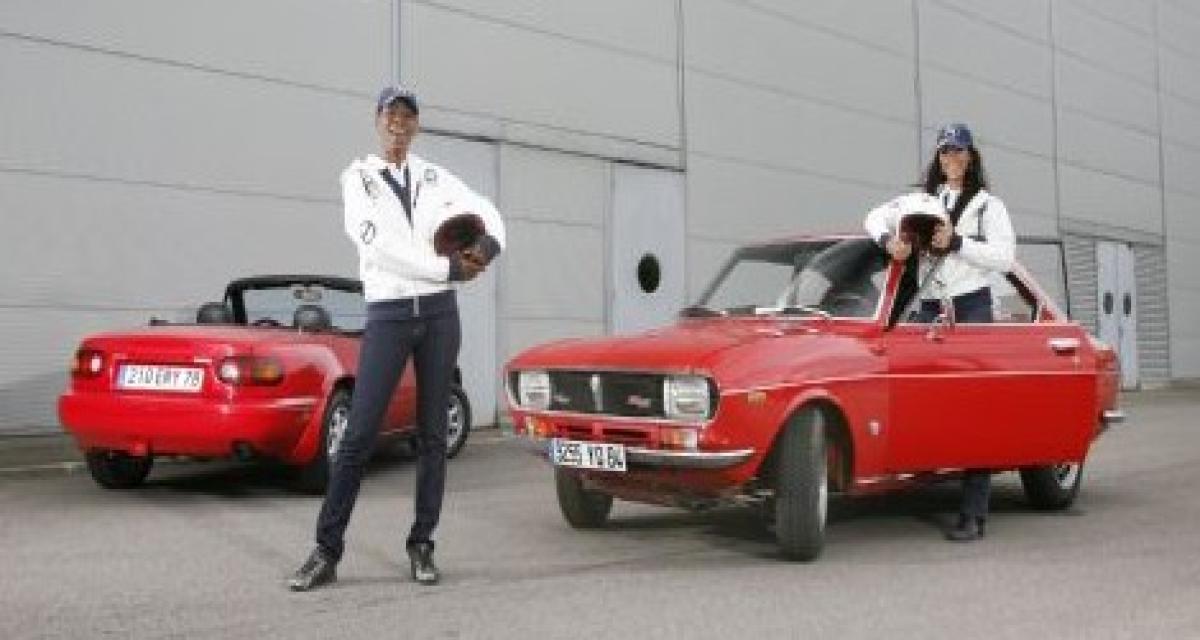 Si la monture change, l’équipage ne change pas: Cindy Fabre (miss France 2005) et Chris Mayne (la moitié de Native.) Elle serviront également de porte-manteaux pour la collection de vêtements « Mazda Heritage ».