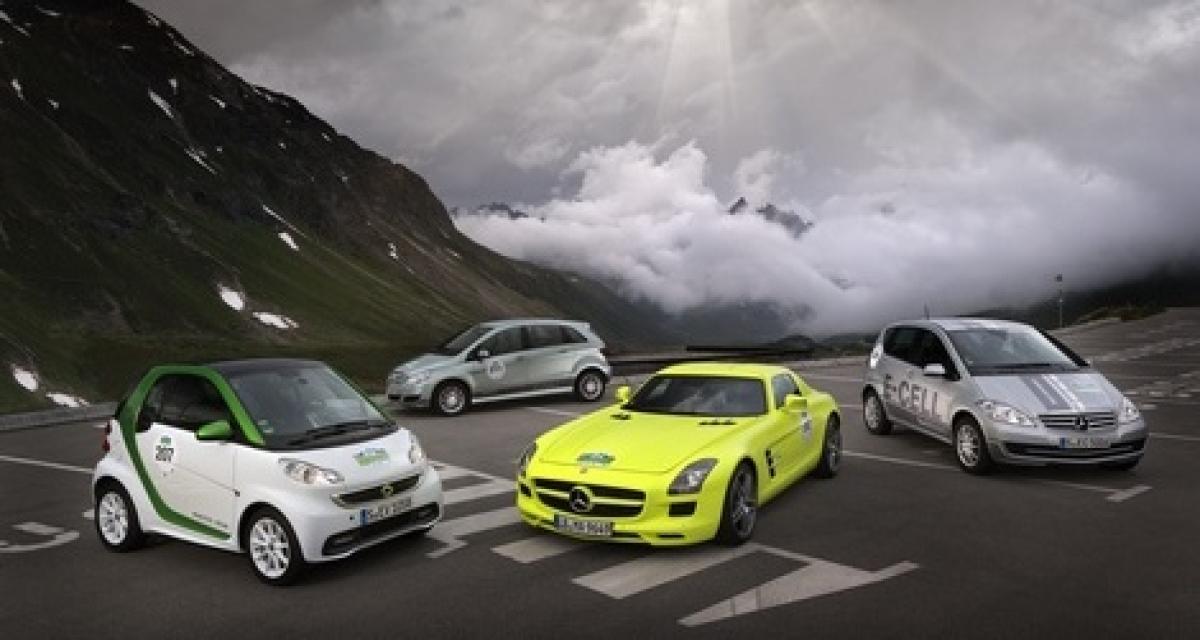 Montafon, Autriche, ces derniers jours (5 au 7 juillet)…. Mercedes a aligné plusieurs autos au départ de ce rallye de régularité, troisième édition du nom. On a ainsi pu retrouver deux Classe A E-Cell, une paire de Classe B F-Cell, deux Smart Forwto ED ainsi que la plus sportive SLS AMG E-Cell.