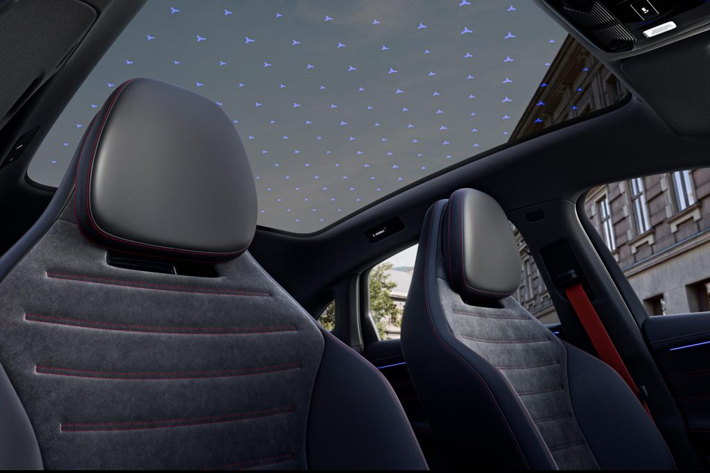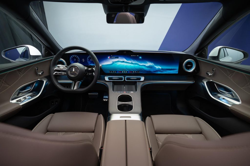 A l’intérieur, on retrouve le désormais « classique » immense dalle (continue cette fois) qui va d’un bout à l’autre de la planche de bord : 39,1 pouces. C’est un « saut » par rapport à la Classe C actuelle. Mais est-ce mieux ? La console centrale forme une sorte de pont. Elle a l’air très envahissante entre les deux occupants avant de la voiture. On notera l’immense toit vitré panoramique qui peut être obscurci avec 162 étoiles.