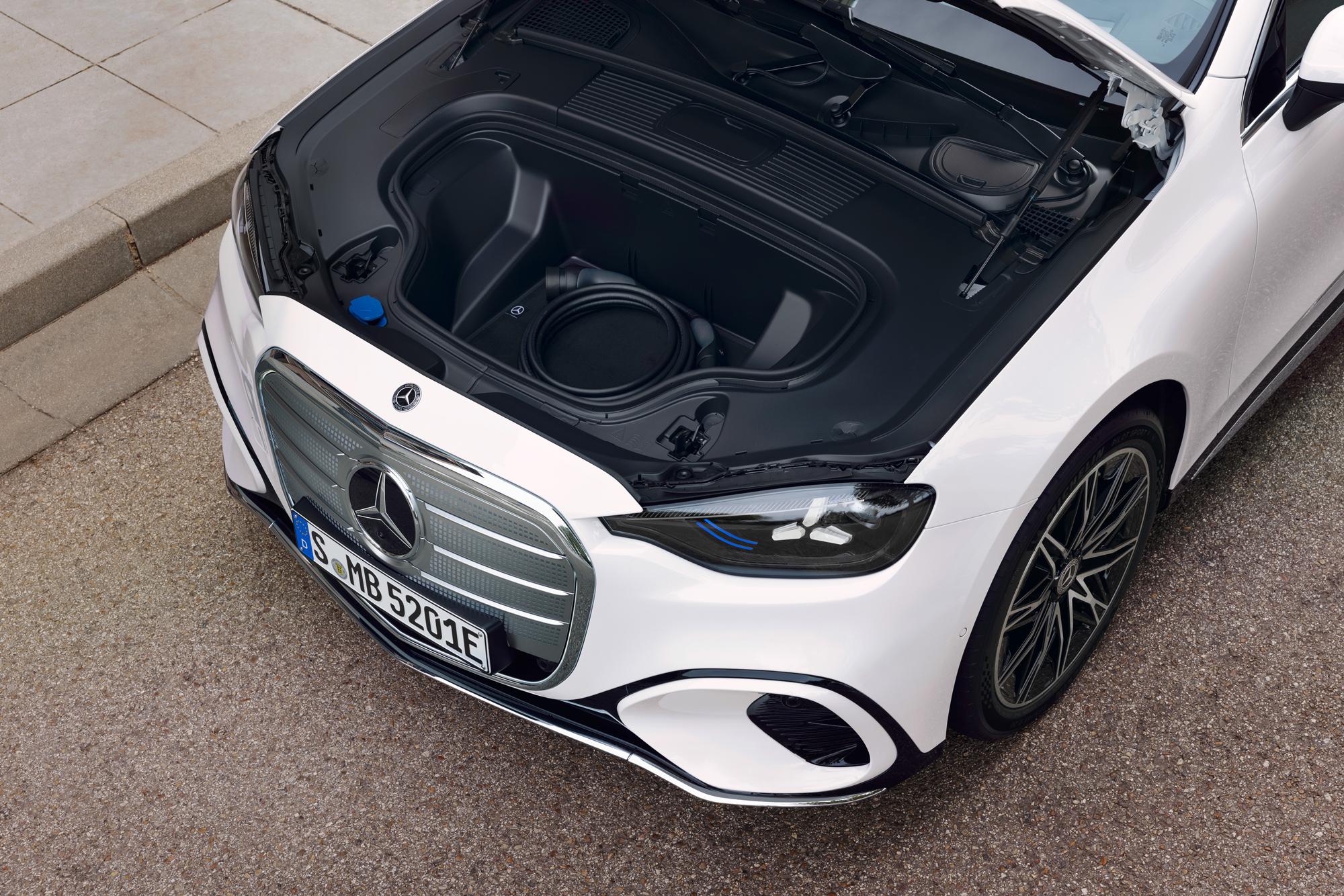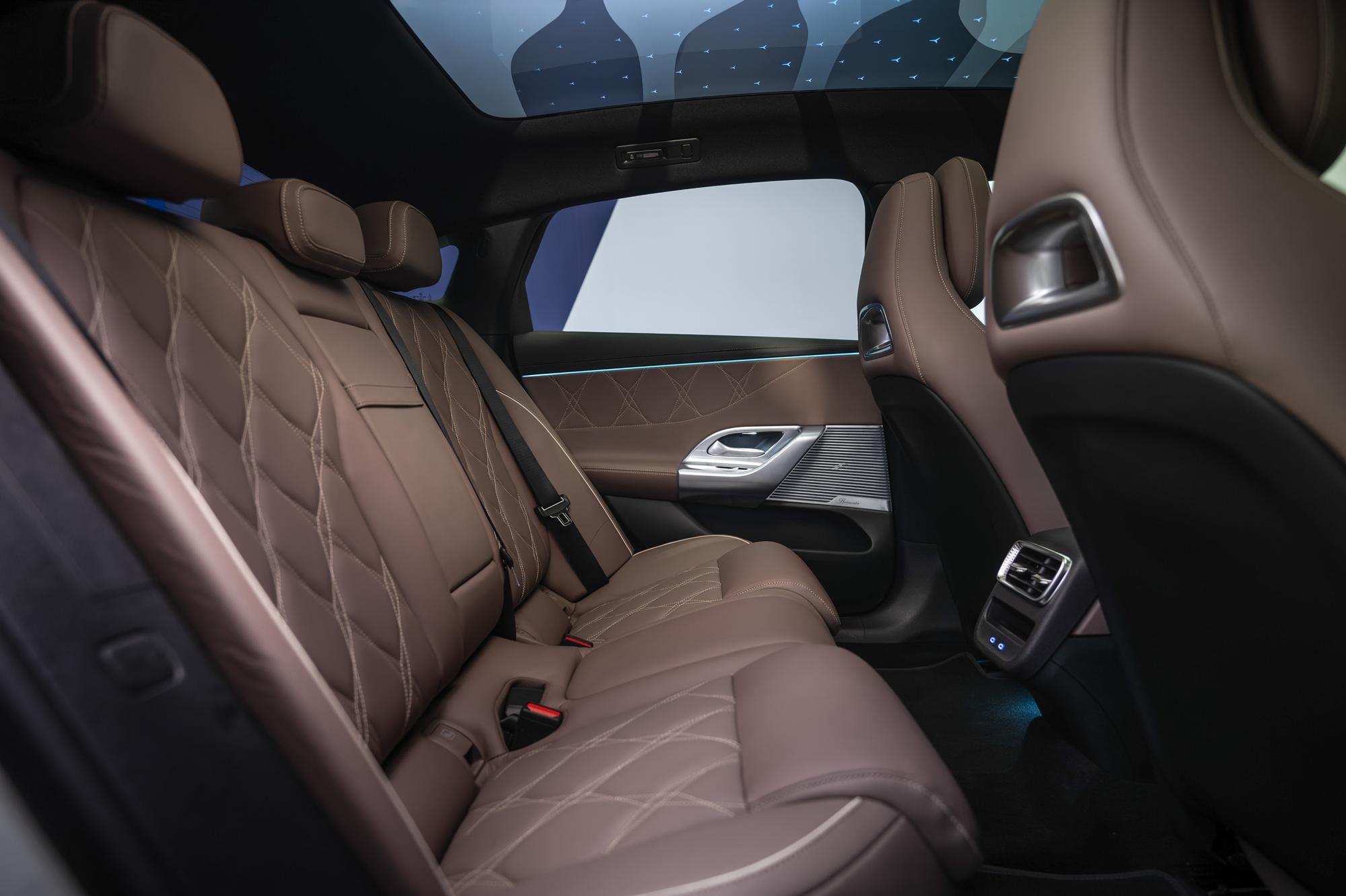 L’architecture électrique dédiée permet un empattement de 2 962 mm, soit 97 mm de plus que sur la Classe C thermique. Conséquence directe : 12 mm de dégagement supplémentaire aux genoux à l’avant. Le coffre affiche 470 litres, auquel s’ajoute un coffre avant (frunk) de 101 litres. La capacité de remorquage atteint 1,8 tonne avec l’attelage semi-électrique en option.