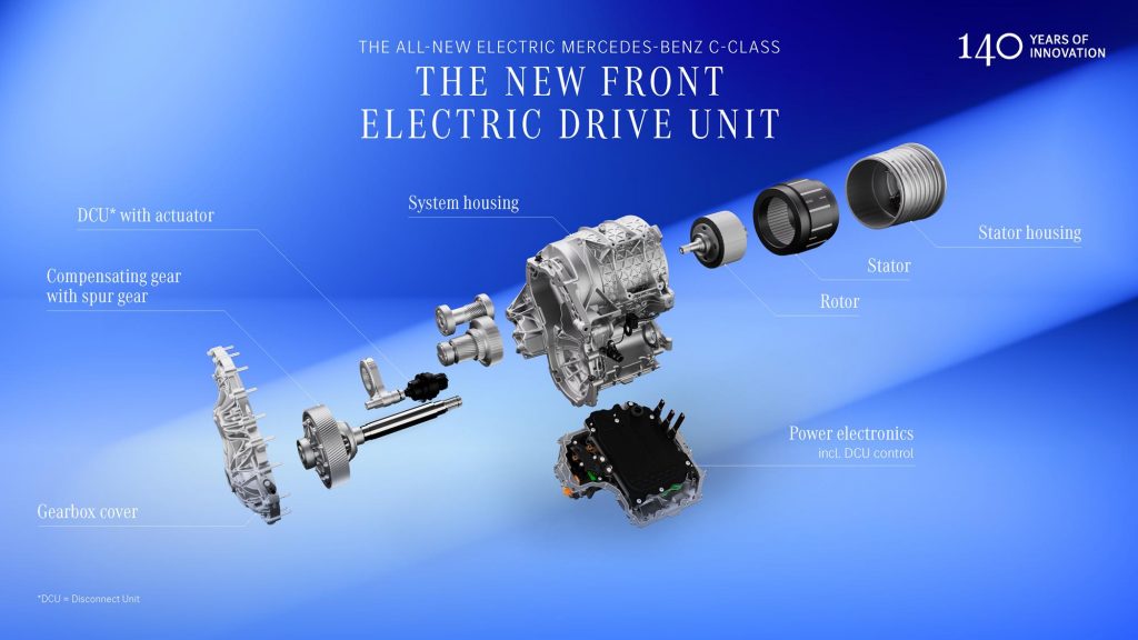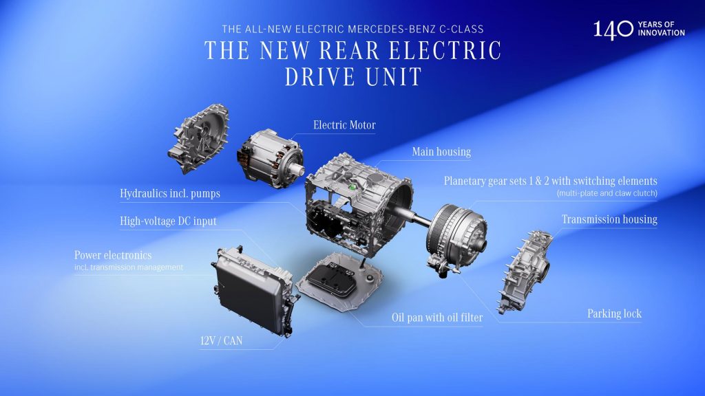 Le C 400 4MATIC reçoit deux moteurs synchrones à aimant permanent (PSM), un par essieu. La puissance totale atteint 360 kW, avec un 0 à 100 km/h annoncé en 4,0 secondes. La transmission à deux rapports sur l’essieu arrière a été développée pour conjuguer efficacité en ville (rapport court 11:1) et performance autoroutière (rapport long 5:1). C’est très rare (unique ?) dans le domaine du VE car souvent l’ajout d’une boîte à plusieurs rapports consomme le gain d’énergie obtenu.