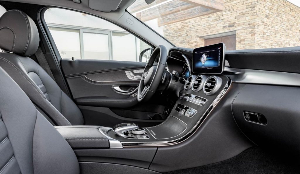 À l’intérieur, la Mercedes Classe C restylée se met à la page technologique sans toutefois succomber à l’écran « widescreen » décliné sur tous les modèles de la marque. Elle reste fidèle à l’instrumentation analogique avec un écran 5,5 pouces entre le tachymètre et le compte-tours, mais offre en option un combiné d’instrumentation numérique de 12,3 pouces issu de la Classe S.