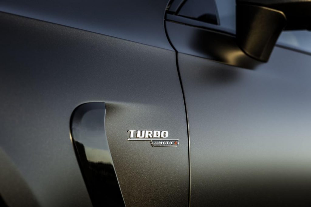 Les feux arrière sont reliés entre eux par un élément de design rouge foncé qui accentue la sensation de largeur musclée de l'arrière. Les éléments principaux sont les doubles sorties d'échappement rondes, intégrées dans la jupe arrière dans la zone latérale derrière les passages de roue pour améliorer l'aérodynamisme. Le becquet du couvercle de coffre est peint dans la couleur du véhicule, mais il est également disponible en noir en option dans les packs de design extérieurs AMG.