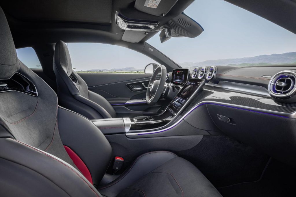 Outre ce qui est repris de la CLE " de base", soit le système d'infodivertissement MBUX de dernière génération avec instrumentation entièrement numérique de 12,3 pouces, l'écran central de 11,9 pouces orienté vers le conducteur et l'éclairage d'ambiance dynamique de 64 couleurs, la version AMG propose des spécificités comme les sièges intégraux en ARTICO/microfibre noire MICROCUT avec graphisme spécifique et surpiqûres contrastées rouges, des ceintures de sécurité rouges et des garnitures en carbone brillant ou encore le volant Performance AMG de série, à méplat et à doubles branches.