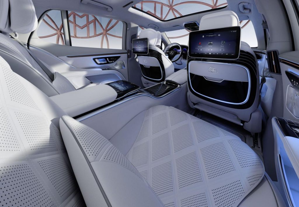 Les passagers arrière disposent chacun d'un écran d'infodivertissement de 11,6 pouces et peuvent afficher et même saisir la destination de navigation, tandis qu'à l'avant, le tableau de bord MBUX Hyperscreen à triple affichage, en option sur les modèles EQS inférieurs, est standard et livré avec des graphiques spécifiques à Maybach.