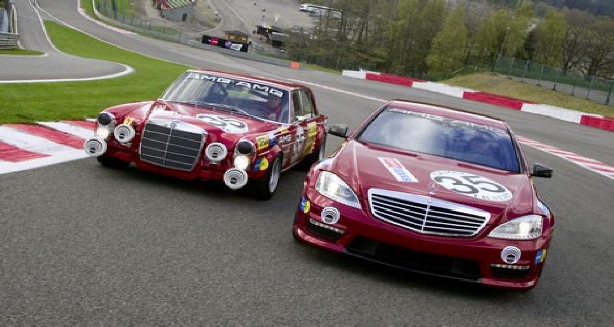 Mercedes aime bien les photos de famille. Après la 300 SL et la SLS AMG au Mexique, voici la 300 SEL 6,8 AMG de 1971 et une S63 AMG à Spa.