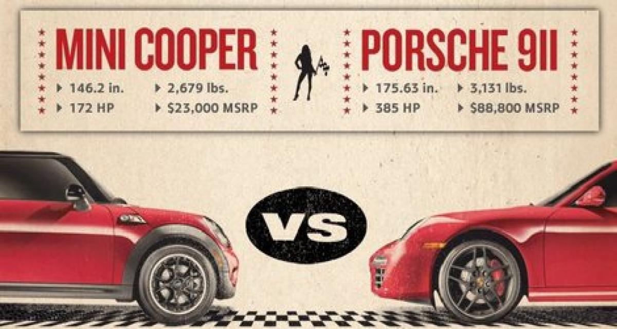 Et comme le met en lumière l’image illustrant ce billet, les adversaires sont clairement annoncées. D’un côté la Mini Cooper S et ses 184 ch, 1 205 kg et 223 km/h en vitesse de pointe. De l’autre la Porsche 911 Carrera S forte de 385 ch, 1 425 kg et 302 km/h en v-max ce pour ne reprendre que quelques données de leur fiche technique respective.