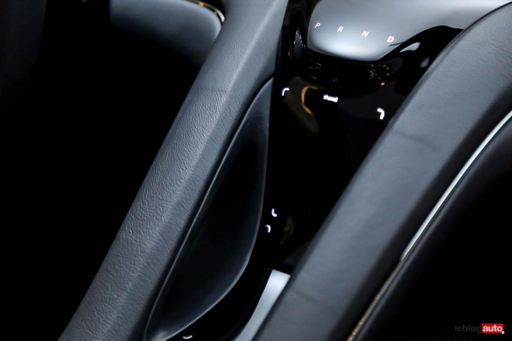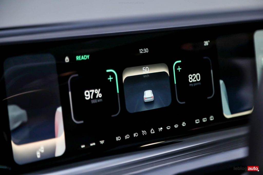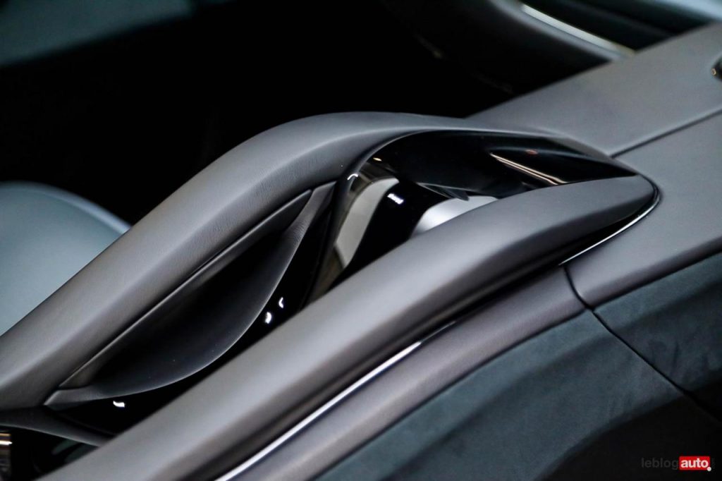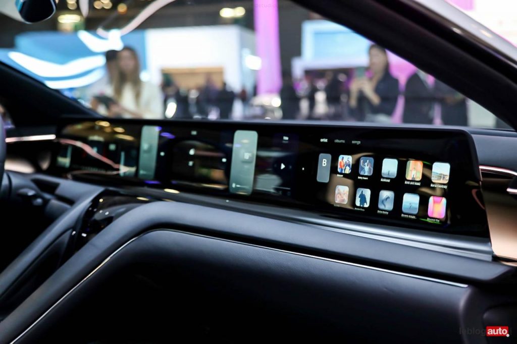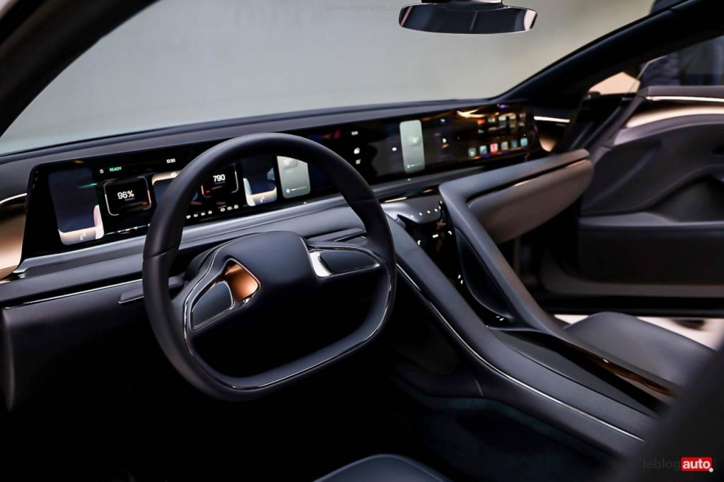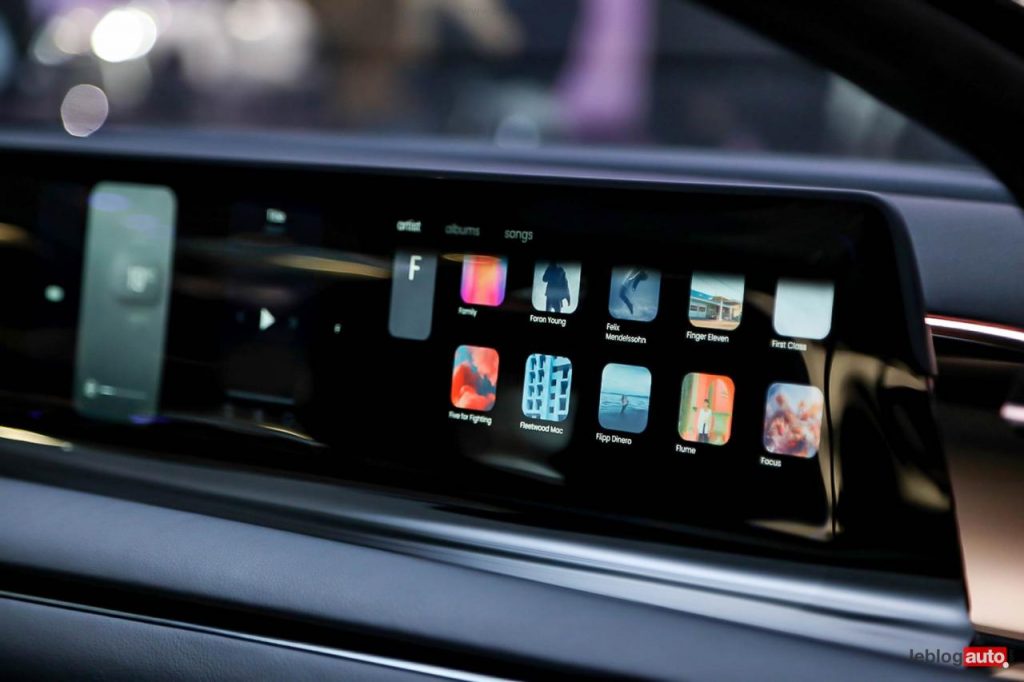A l'intérieur, c'est ultra simple sans être simpliste. On a une longue dalle numérique qui court d'un bout à l'autre de la planche de bord. Le bas de la console centrale est aussi esthétique avec deux lignes qui se rejoignent pour créer le creux dans lequel se loges quelques commandes. En revanche, noir laqué cela craint les traces de doigts. C'est lisse, élégant et même le volant est épuré. Tout est tactile, un tactile haptique, avec sensation retour d'information.