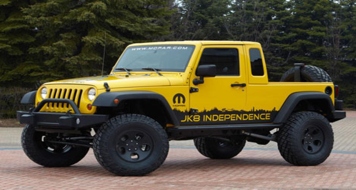 Le clou du spectacle pour la Wrangler est la JK8 Independance. Mopar dévoile en effet un kit complet pour transformer soi même la Wrangler en pick-up, puisque Jeep se refuse toujours à proposer un hériter au Scrambler CJ8…. Le kit comporte toutes les pièces nécessaires pour habiller la partie arrière et donner naissance à un benne complète…