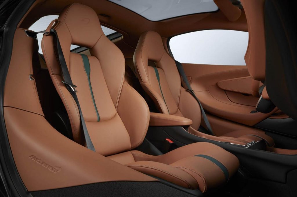 Pour cette 570GT XP Green, McLaren Special Operations a repris les codes couleur de son aïeule. La petite 570 arbore une livrée Vert XP rehaussée par des liserés orange sur le bouclier avant, les portières, les bas de caisse et l’entourage du diffuseur arrière. La 570GT XP Green se démarque cependant de la F1 XP GT par une teinte « Dark Palladium » apposée sur le splitter, les entrées d’air, les jupes latérales et le diffuseur.