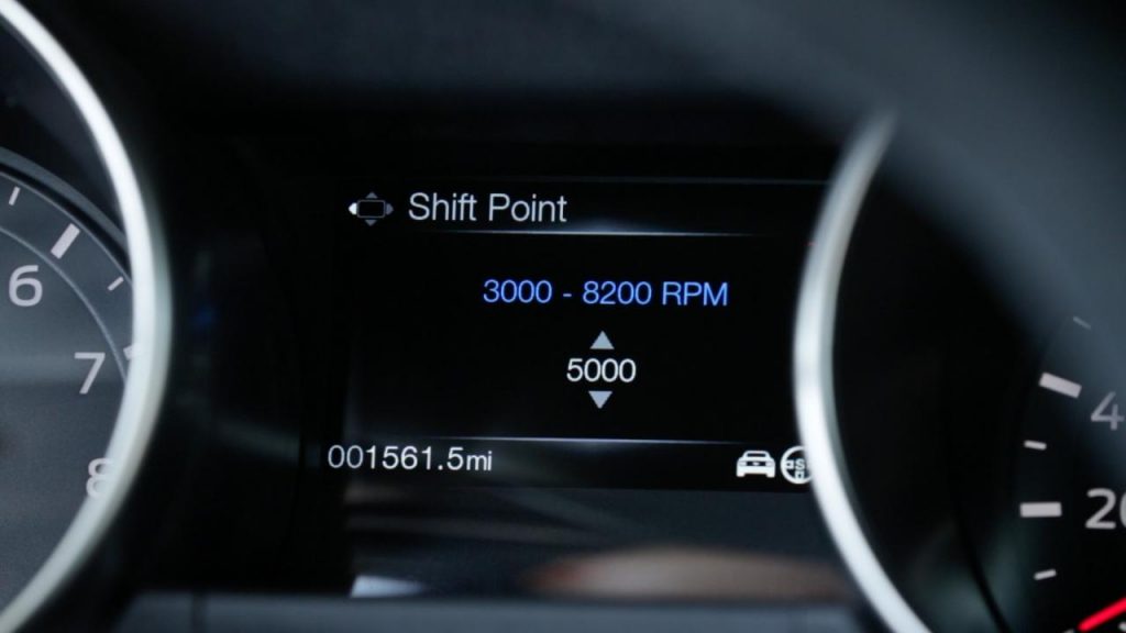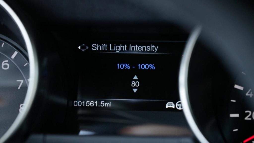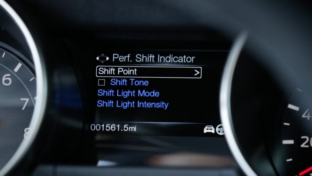 Les trois modes détaillés par Ford (Track, Tach et Drag) peuvent être réglés par le conducteur via l’ordinateur de bord. A chaque bien évidemment sa spécificité. Comme son nom l’indique, le mode Drag se destine aux drag races : la barre de leds (dont on peut régler l’intensité) reste obscure jusqu’à ce qu’elle clignote de façon répétée afin d’indiquer le bon moment pour changer de rapport.