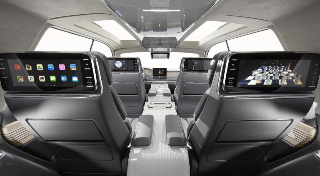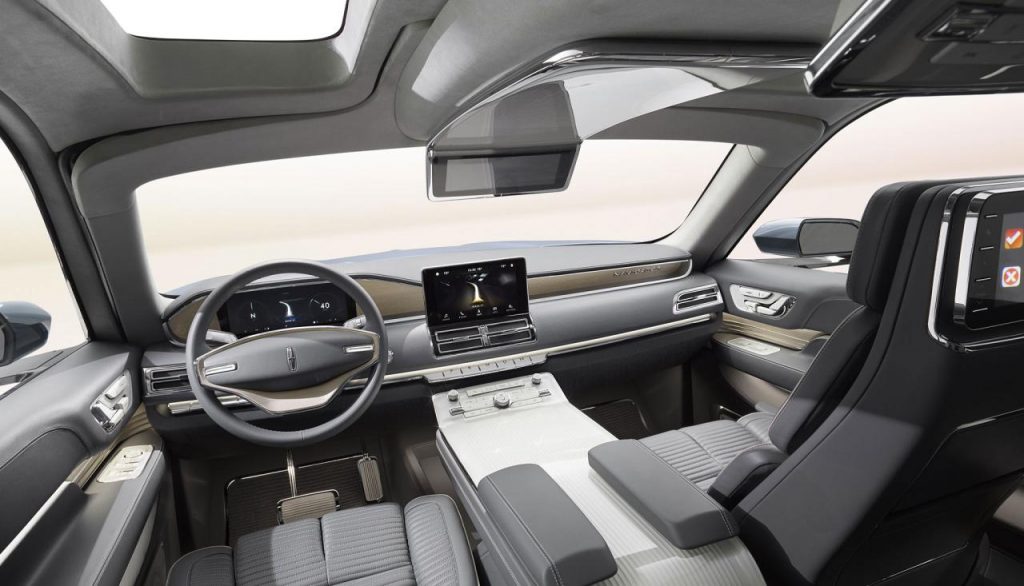 Pour donner un aspect plus conceptuel au style qui semble très abouti, Lincoln a prévu de grandes portes papillon pour l’accès à bord, et un véritable escalier escamotable. On notera aussi le pavillon sur lequel les zones vitrées définissent le logo Lincoln.
