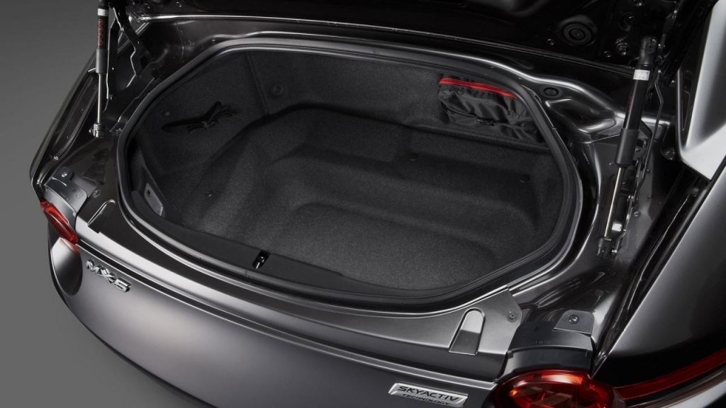 Plus polyvalente, cette MX-5 RF profite d’une meilleure insonorisation avec son toit rigide, mais aussi d’un curseur confort / comportement légèrement décalé vers le confort. A bord, la sellerie est en cuir Nappa. Enfin soulignons que le volume du coffre ne souffre nullement, et affiche toujours 130 litres avec les mêmes dimensions.