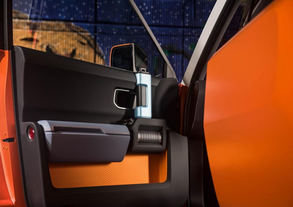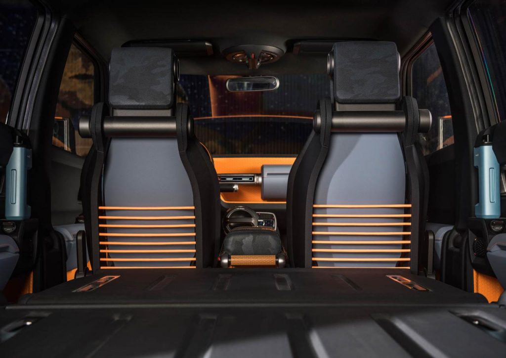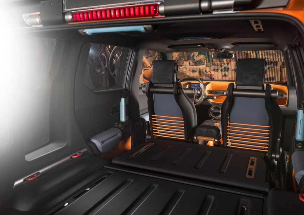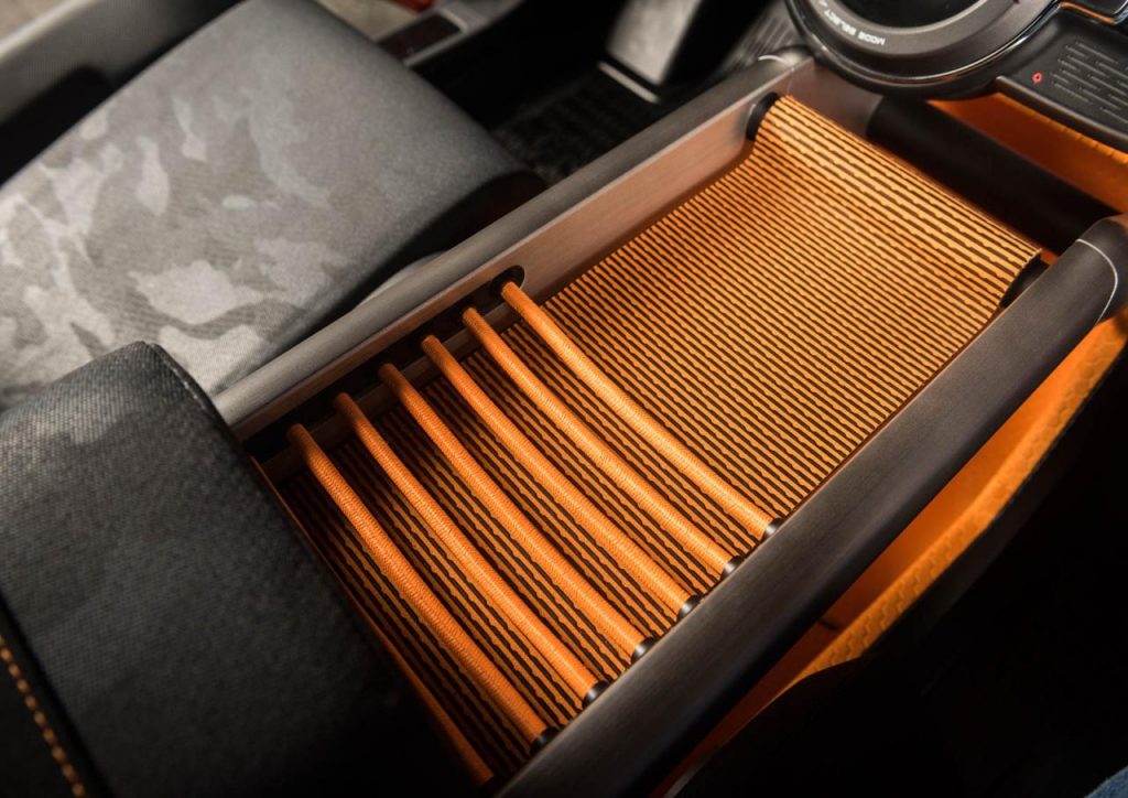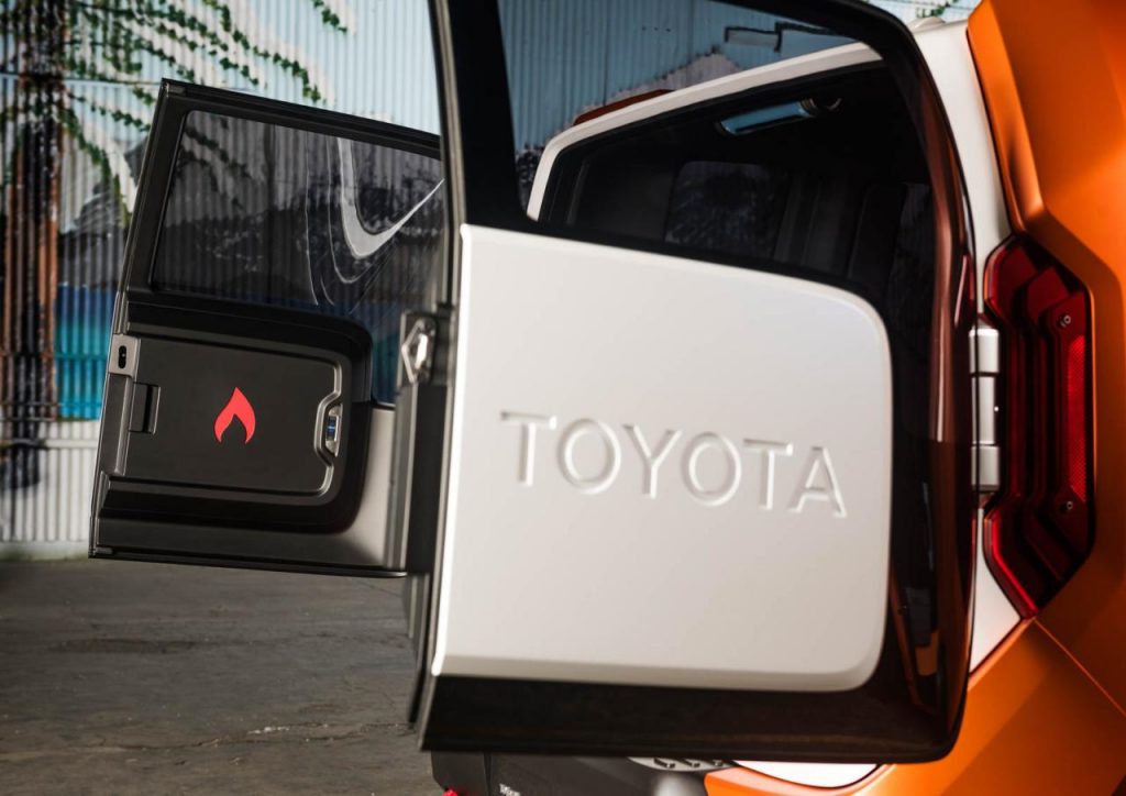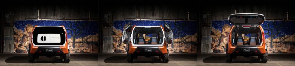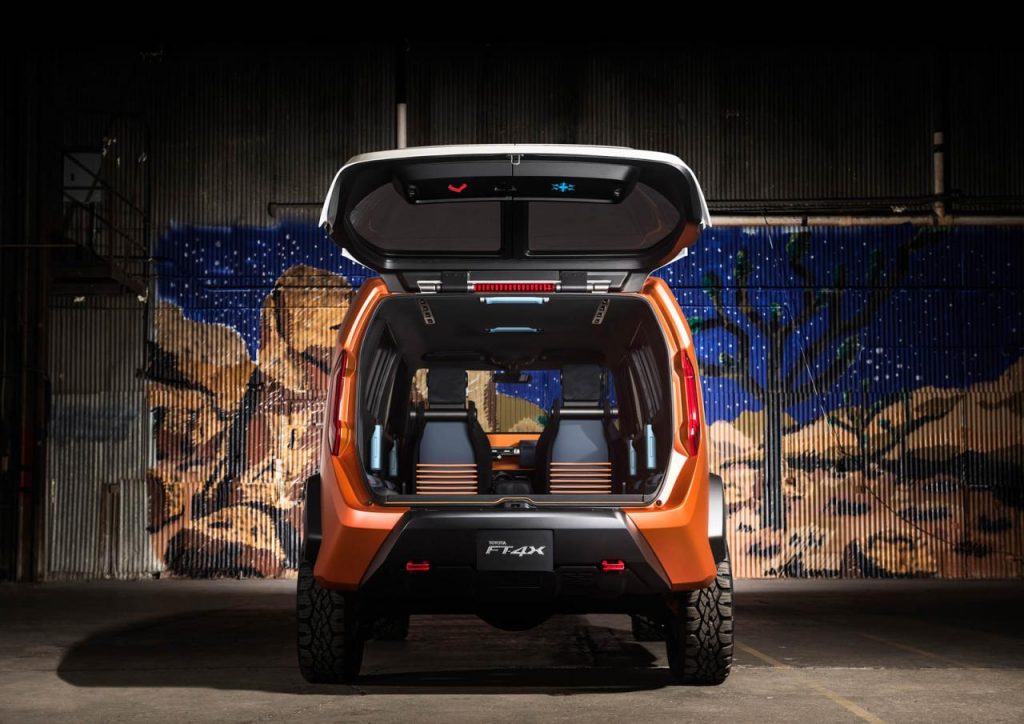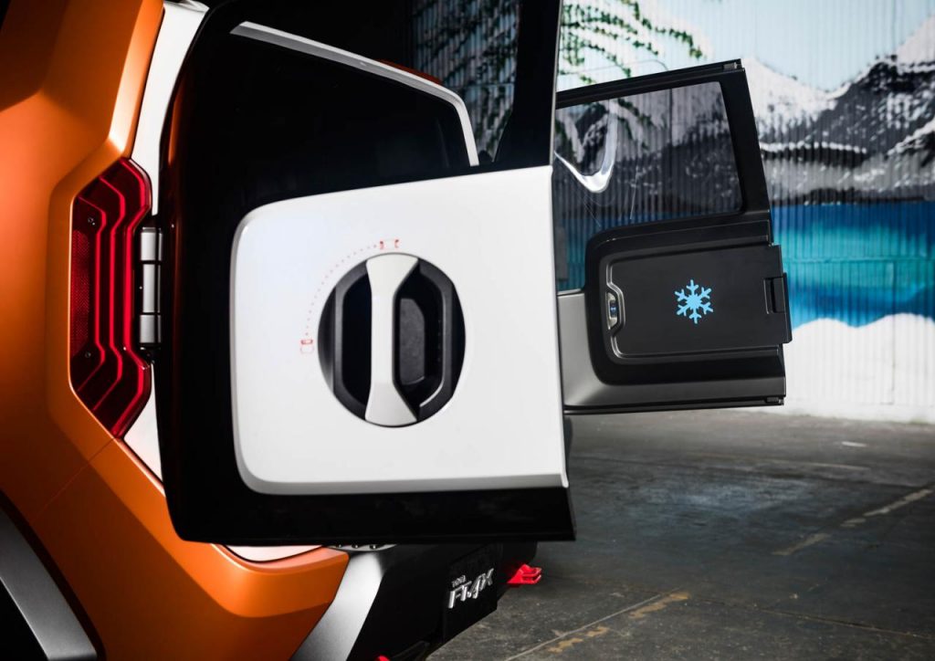 Les designers ont eu la bonne idée de concevoir un hayon arrière innovant qui peut s’ouvrir comme un hayon traditionnel (mode « outdoor ») ou comme deux portes battantes d’un utilitaire (mode ville). Il suffit de tourner une poignée rotative sur la partie gauche du hayon. Il fallait y penser. La partie arrière embarque également des prises électriques pour brancher des équipements de camping tandis qu’un sac de couchage North Face prend place entre les sièges avant. Le FT-4X est même équipé de compartiments chauffés et refroidis pour y stocker de la nourriture. Enfin, le rétroviseur côté conducteur intègre une caméra GoPro.