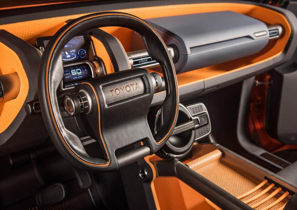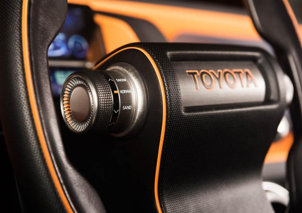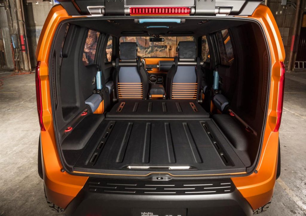 L’intérieur est aussi rustique que l’extérieur et se démarque de ses congénères de salon automobile par l’absence d’écrans tactiles. Le système audio est contrôlé par six boutons dont un rotatif plutôt massif. L’instrumentation est cependant digitale et Toyota a installé au-dessus un support smartphone directement face au conducteur. L’habitacle est séparé en deux zones, une zone sèche localisée sur les sièges avant et une zone humide au niveau de la banquette arrière. Quant au coffre au plancher plat, il est équipé de lampes torches.