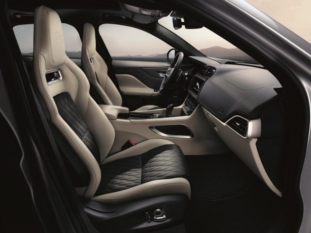 À l’intérieur, le F-Pace SVR reçoit des sièges avant type baquets et des sièges arrière sculptés drapés d’une sellerie en cuir au motif diamanté. Le volant reçoit un badge SVR et des palettes changement de vitesse en aluminium. Côté numérique, le F-Pace SVR est équipé d’un combiné d’instrumentation de 12,3 pouces et d’un écran d’infodivertissement de 10 pouces.