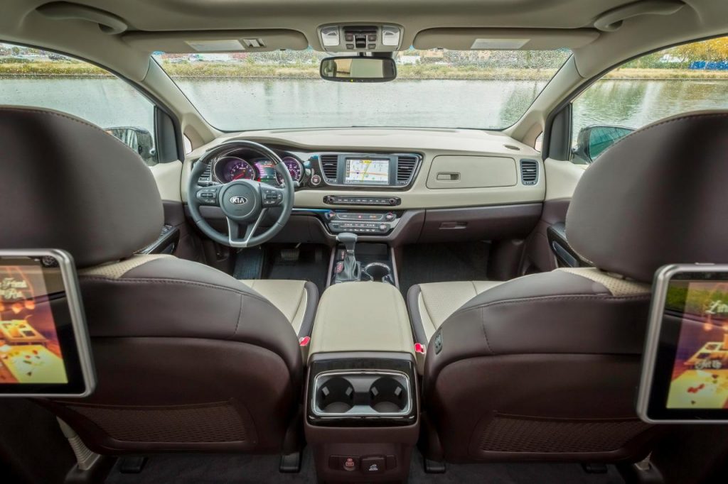 Véhicule familial à la page, le Kia Sedona troque son système d’infodivertissement central arrière par deux écrans tactiles de 10,1 pouces qui permet de connecter son smartphone en mode « Mirror » ou pour accéder à Internet.