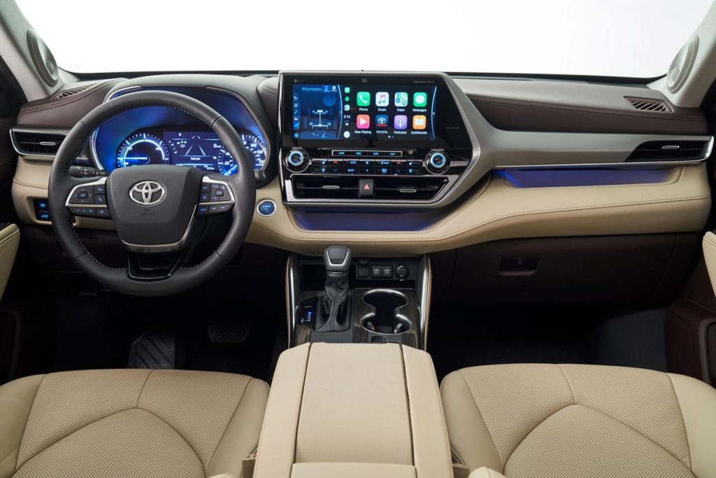La planche de bord mêle à la fois les influences de la précédente génération, avec celles de la plus récente Camry, avec en particulier son imposant écran 12,3 pouces au centre. La planche de bord multiplie les rangements, et le Highlander fait toujours la part belle au confort à bord, pour ses 8 passagers. Ou 7 avec les captain-chairs au second rang.