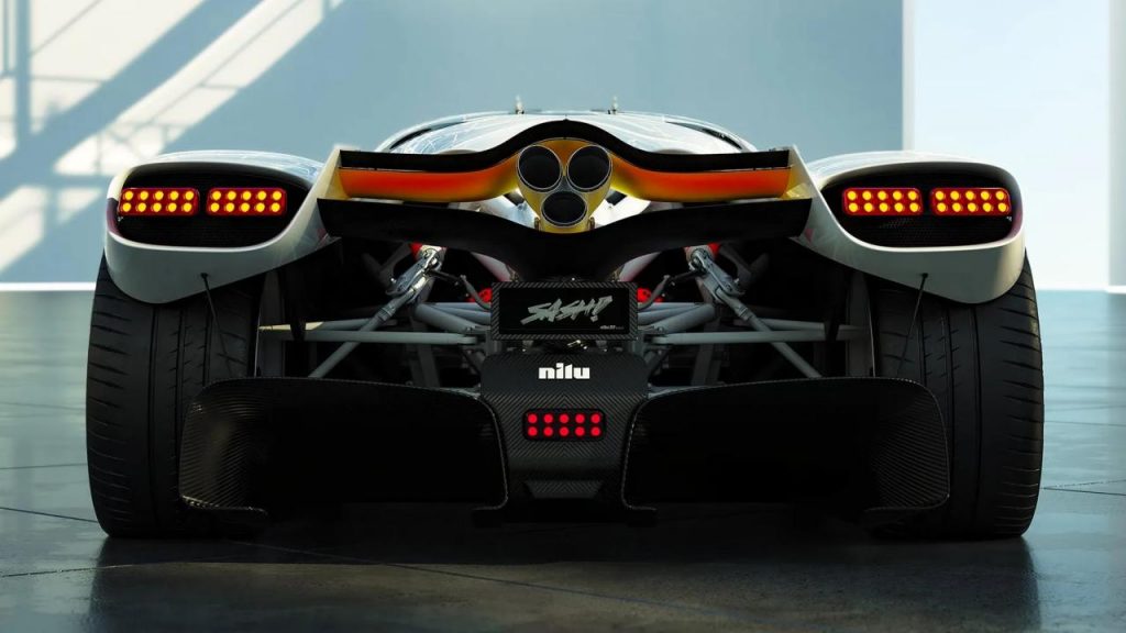 La face avant se caractérise par deux prises d’air béantes, façon Zemvo, cerclées par une bande lumineuse. Musculeuse mais « sensuelle » dans ses courbes comme l’étaient les sportscars des années 60, la Nilu est encore plus spectaculaire dans sa partie arrière, avec des ailes larges. La queue est largement ouverte pour exposer les entrailles du V12, façon Porsche 917, et les portes en ailes de mouette complètent l'ouvrage. L’arrière, avec ses blocs optiques à plusieurs diodes et les sorties d’échappement centrales en Iconel, prend des airs de Pagani.
