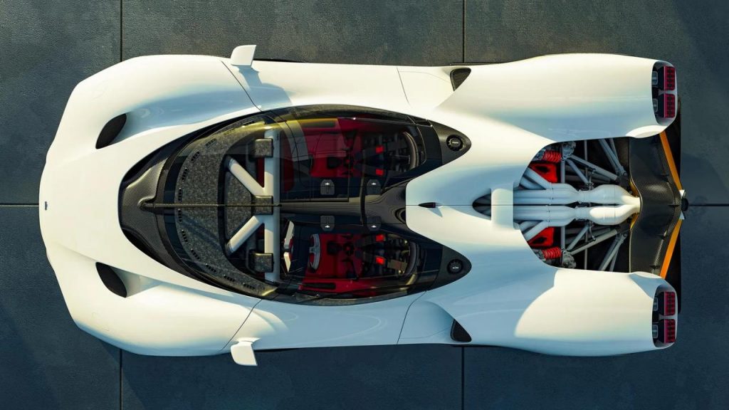 Les intérieurs sont totalement analogiques : le volant n'a pas de commandes, l'instrumentation est traditionnelle, il n'y a pas de sélecteur de mode de conduite et le seul écran est celui de la caméra arrière. Les gros compteurs ronds, avec les indications en rouge sur fond noir, donnent un rendu très « années 80 », y compris dans la police d’affichage choisie. Le réglage de la position de conduite se fait en déplaçant tout sauf les sièges, qui sont fixés à la monocoque en carbone, flanqués d'éléments tubulaires à l'avant et à l'arrière. L'entrée dans la cabine est assurée par un ensemble de portes battantes, et cela semble être un espace… quelque peu restreint. Les sièges sont installés dans une position fixe et enfoncée, inspirés des prototypes du Mans de la fin des années 60