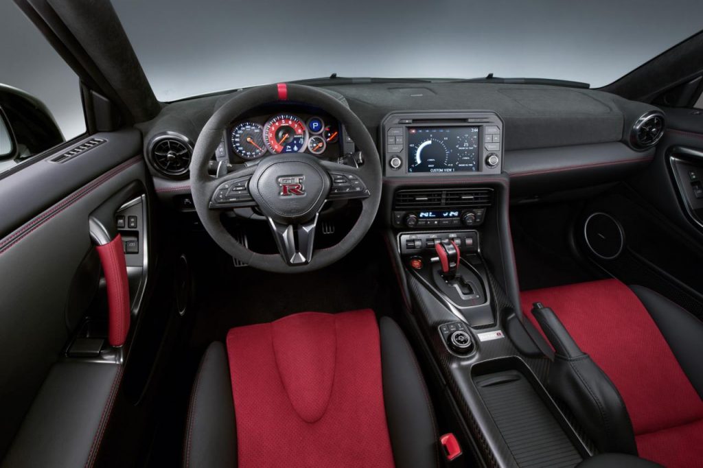 L’intérieur est un des gros points d’amélioration de la GT-R 2017 et la GT-R Nismo en profite en recevant le nouveau tableau de bord, mais elle cultive toujours sa différence avec des inserts en carbone et une belle dose d’Alcantara.