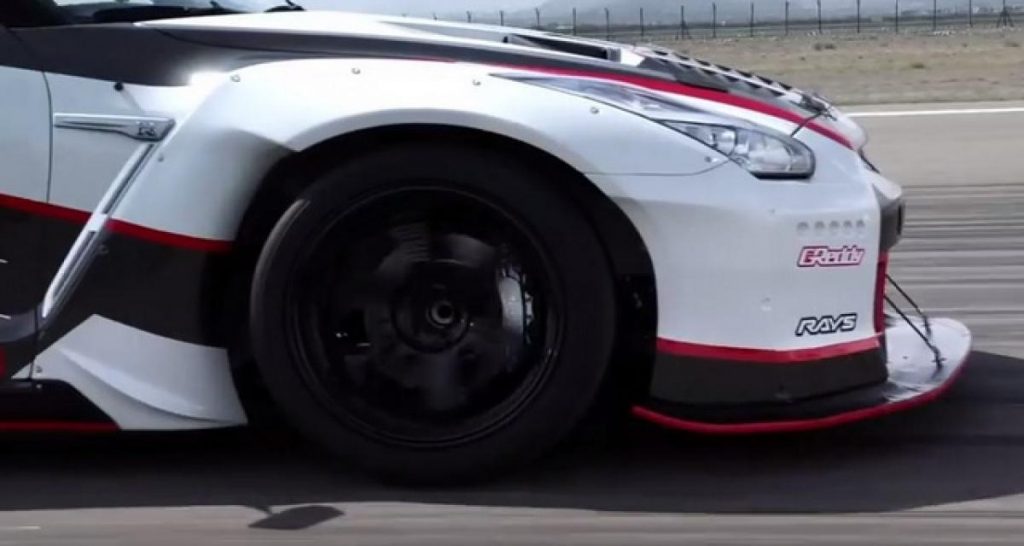 Surprise à plusieurs titres en fait puisque l’on est loin du Nürburgring, vraisemblablement sur un aéroport des Emirats Arabes Unis (Fujaïrah visiblement), et que la voiture que l’on aperçoit n’est pas une GT-R Nismo telle qu’on la connaît bien mais une version préparée qui ressemble comme deux gouttes d’eau à la GT-R Greddy 35RX, un monstre de plus de 1000 chevaux avec laquelle Masato Kawabata écume le championnat japonais de drift D1GP (photo ci-dessous), bien que cette fois la voiture soit cette fois aux couleurs Nismo sur le kit carrosserie typique Rocket Bunny qui équipe l’auto. Les stickers Greddy sur la face avant ne laissent pas planer le doute.